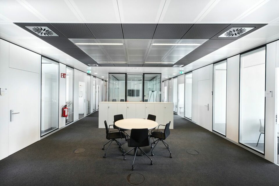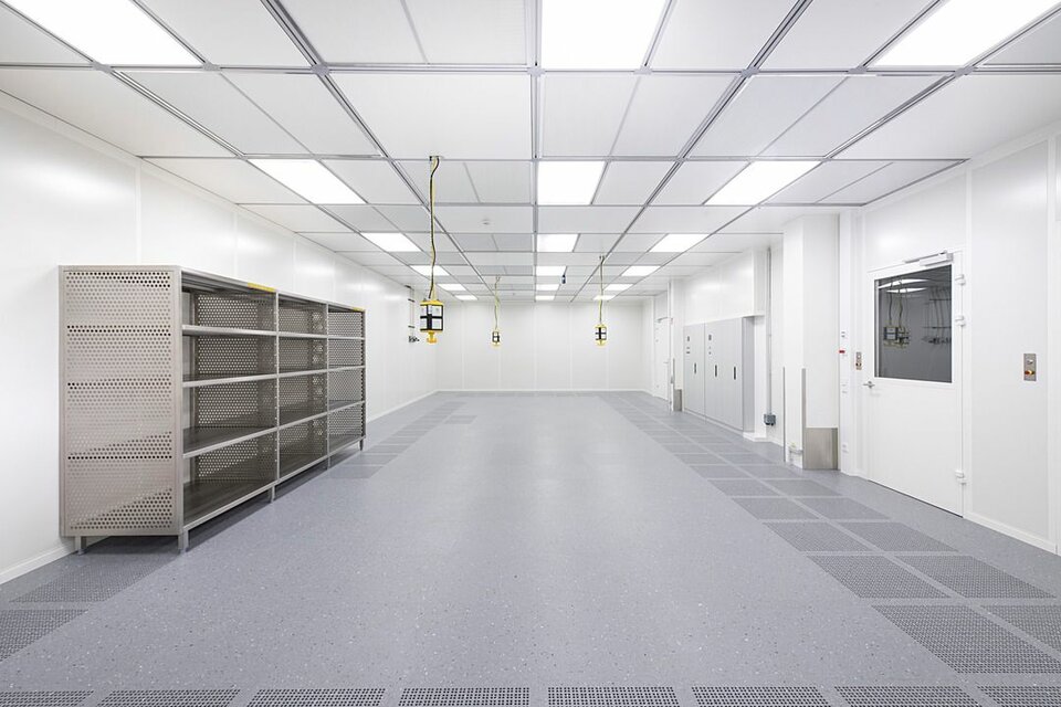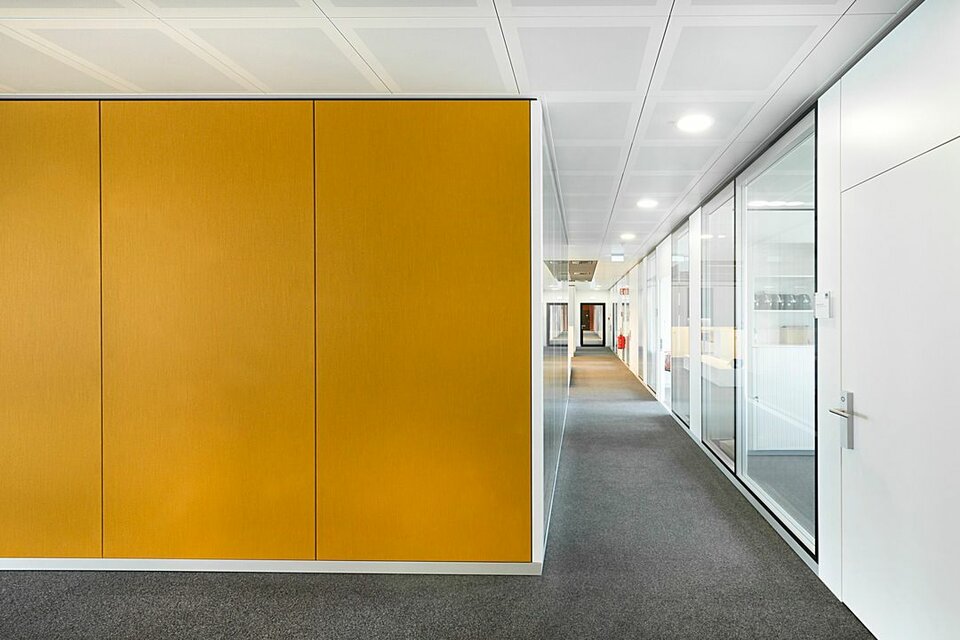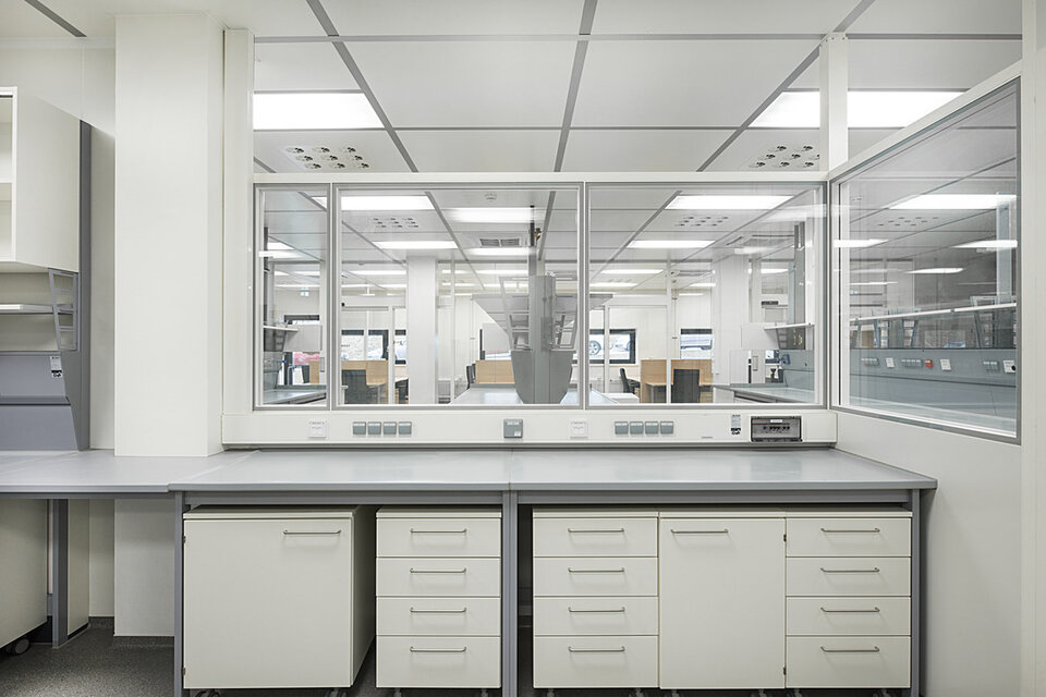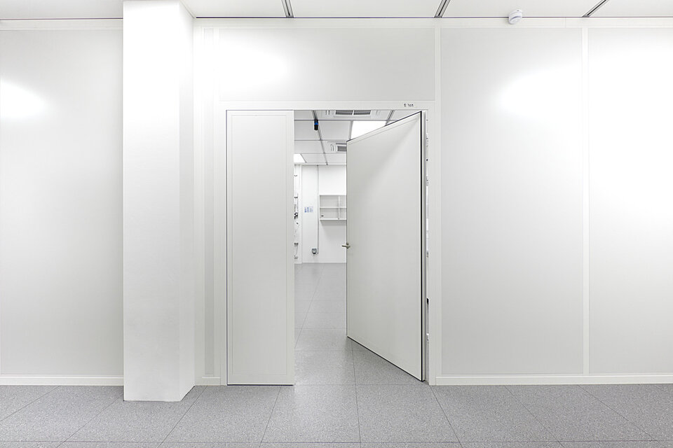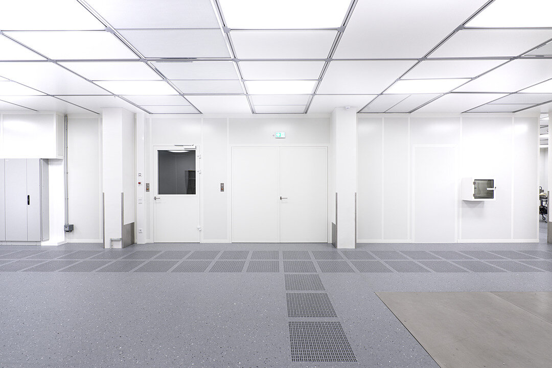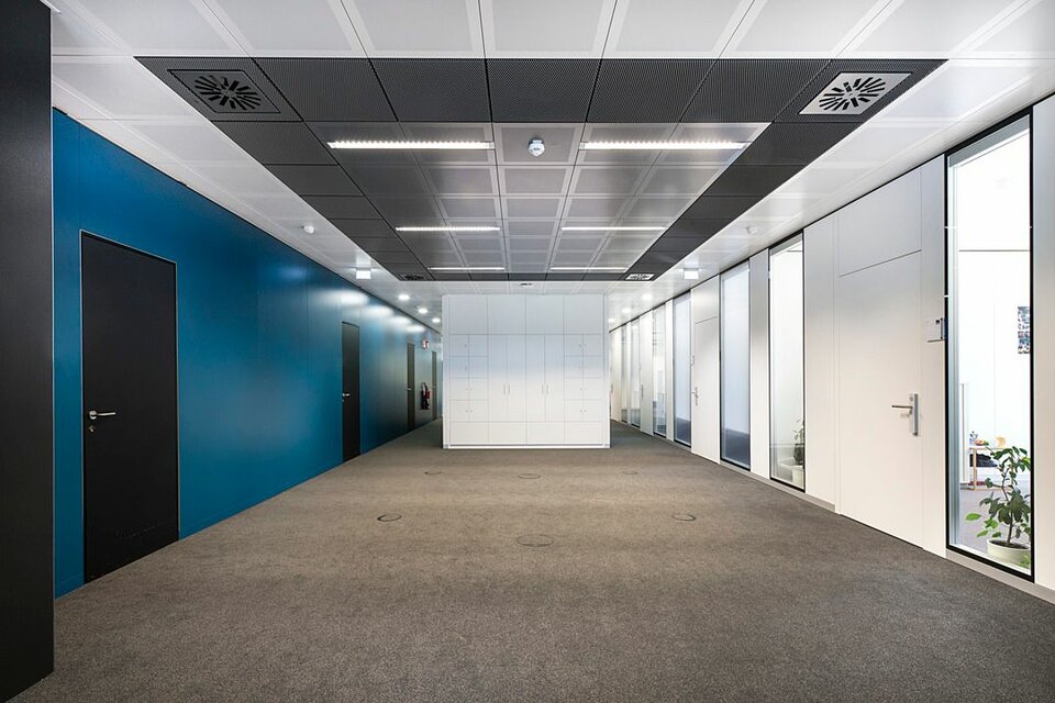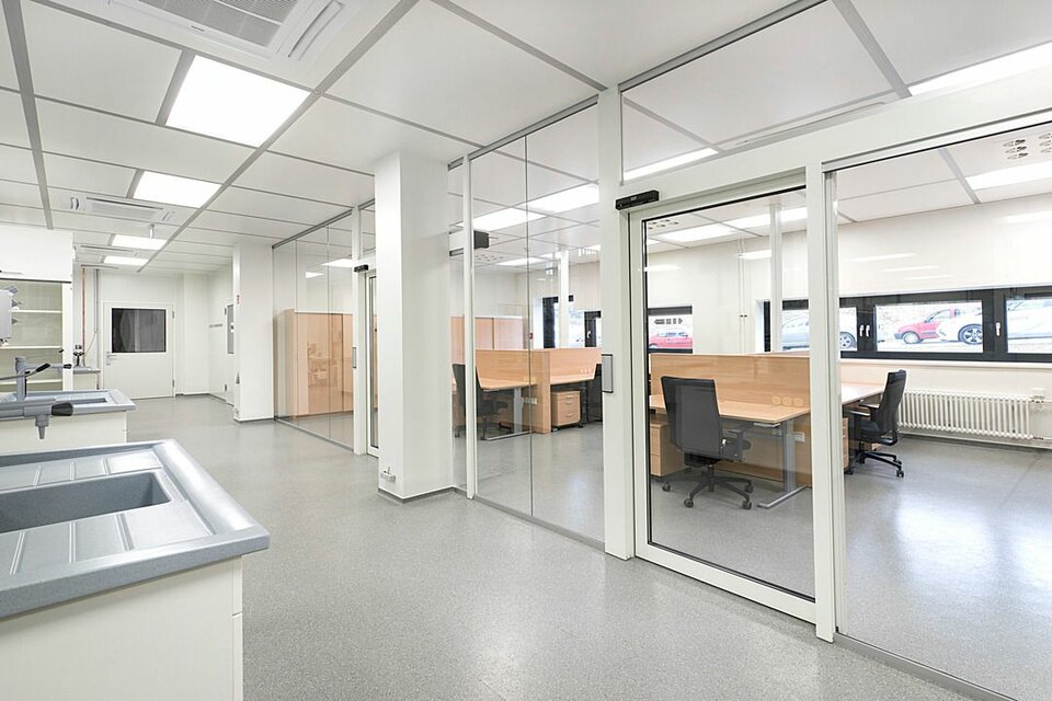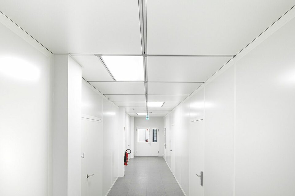 Lindner Reinraumtechnik was awarded with the complete fit-out of the laboratory units and clean rooms. These areas have been fitted with numerous products from the Lindner range, incl. ceilings, partitions, doors, floors and lock systems and improved with several custom solutions such as an entirely freestanding clean room with a specialized ventilation concept. In the office areas, Lindner AG created spatial separation between central passageways and offices by installing Lindner Partitions. Sound absorbers with fabric coating additionally improve acoustics. The second field of performance in the office areas were ceiling systems. LMD-E Hook-on Ceilings have been fitted in all offices and hallways, where their appearance was further improved by so-called expanded metal circles. With integrated ventilation systems and a perforation, the ceilings also serve functional aspects.