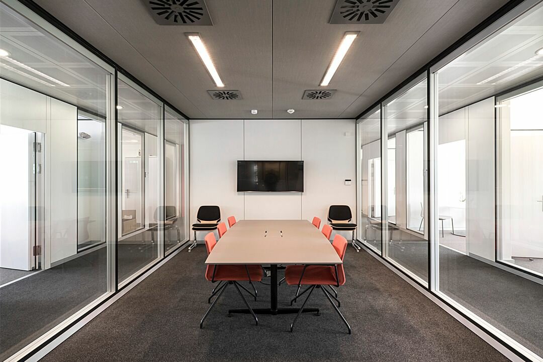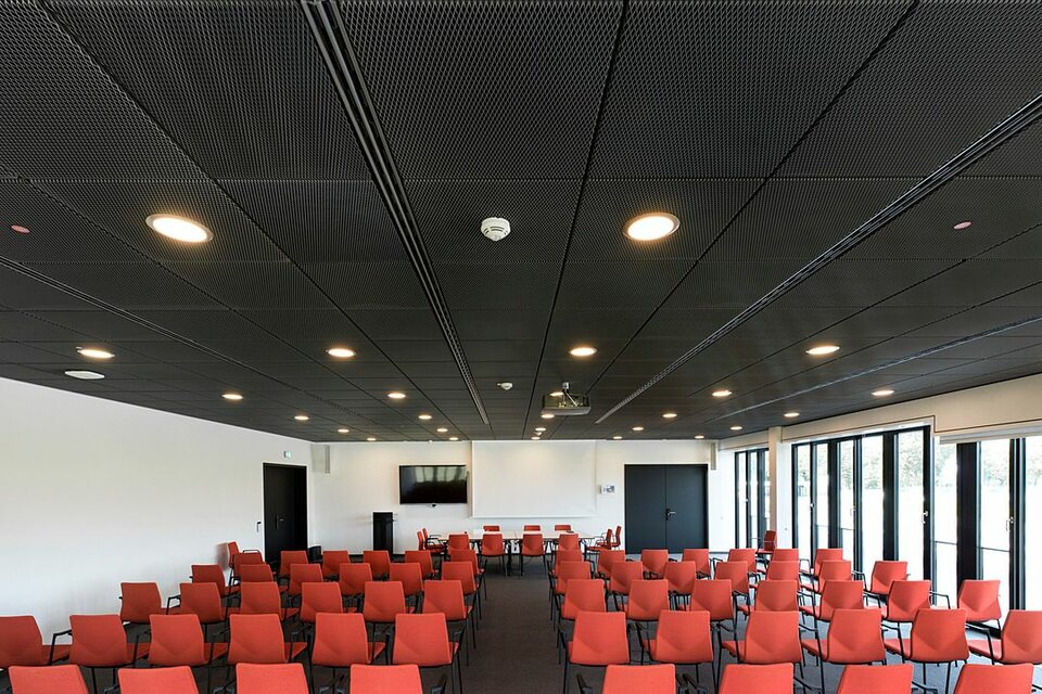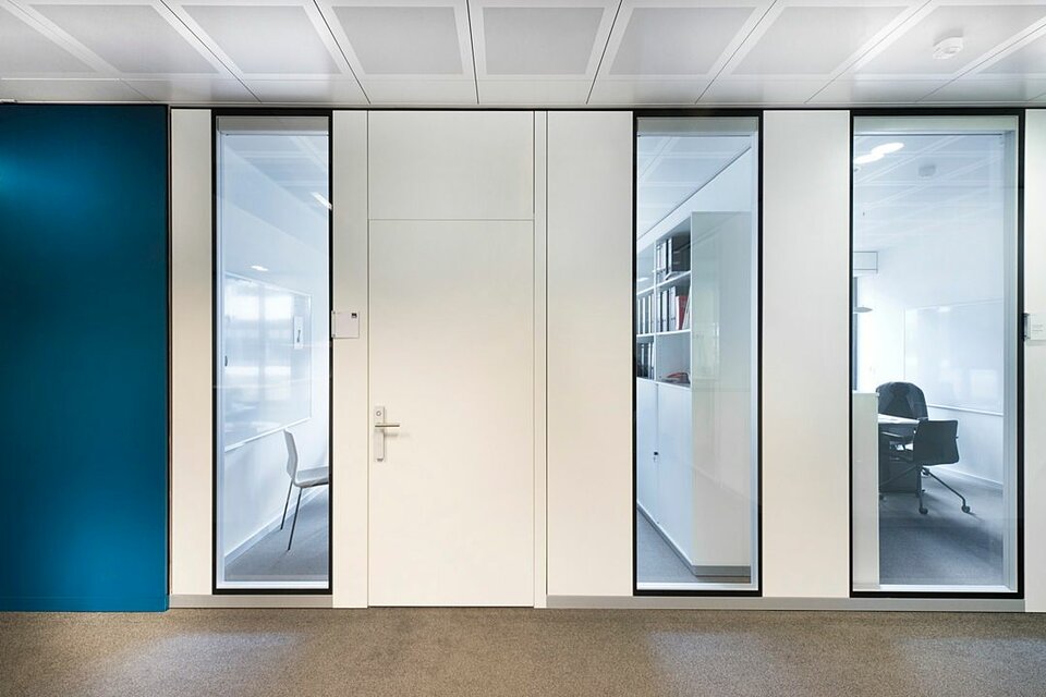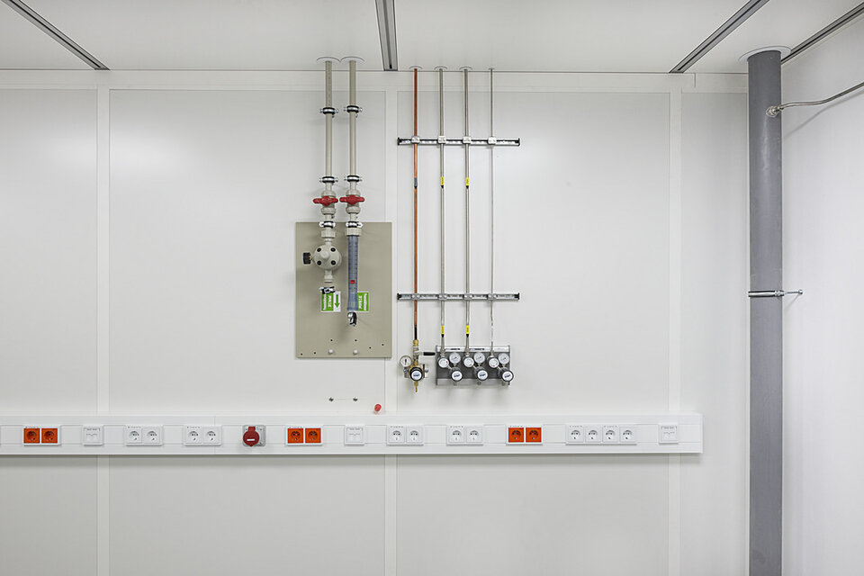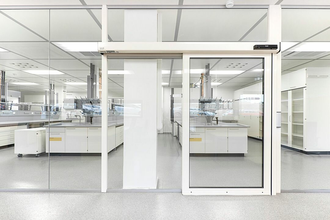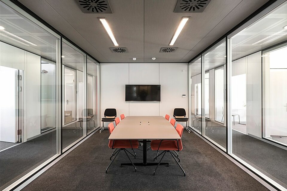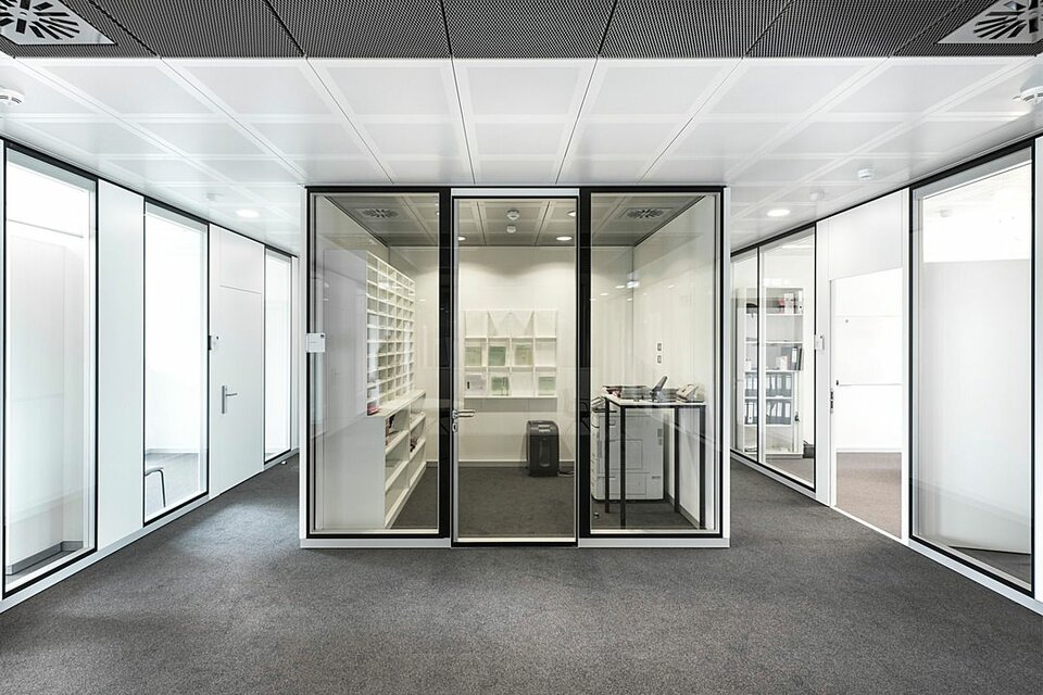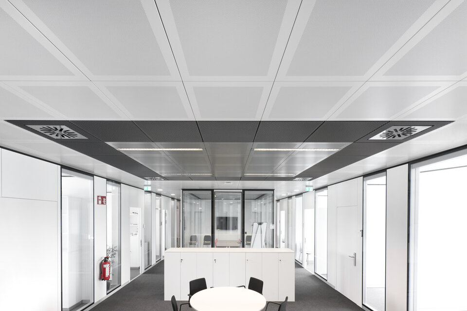Lindner Reinraumtechnik was awarded with the complete fit-out of the laboratory units and clean rooms. These areas have been fitted with numerous products from the Lindner range, incl. ceilings, partitions, doors, floors and lock systems and improved with several custom solutions such as an entirely freestanding clean room with a specialized ventilation concept. In the office areas, Lindner AG created spatial separation between central passageways and offices by installing Lindner Partitions. Sound absorbers with fabric coating additionally improve acoustics. The second field of performance in the office areas were ceiling systems. LMD-E Hook-on Ceilings have been fitted in all offices and hallways, where their appearance was further improved by so-called expanded metal circles. With integrated ventilation systems and a perforation, the ceilings also serve functional aspects.