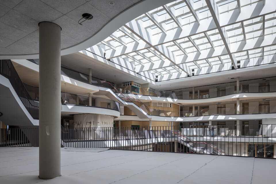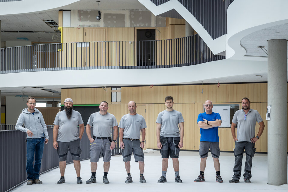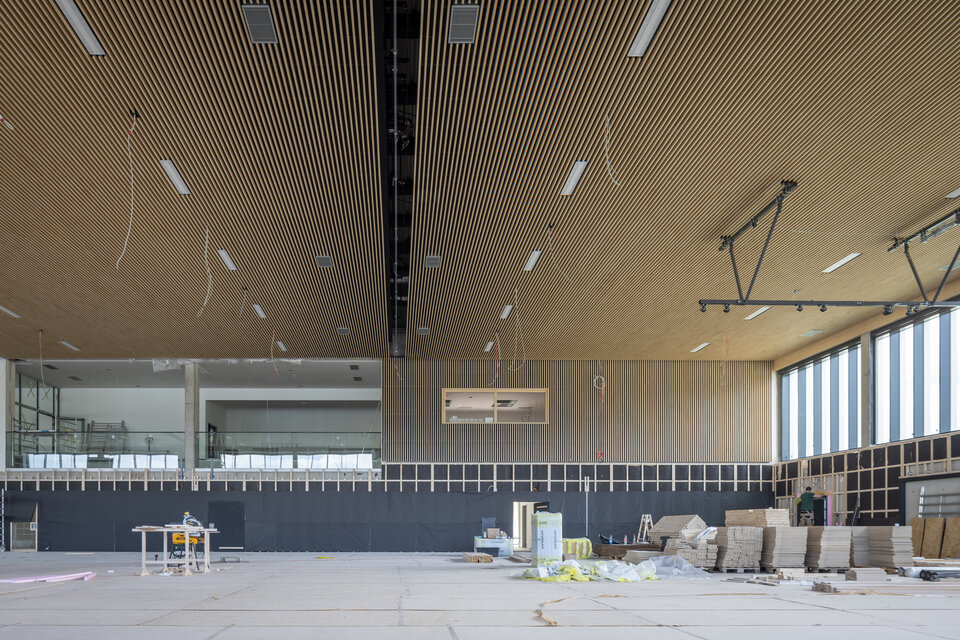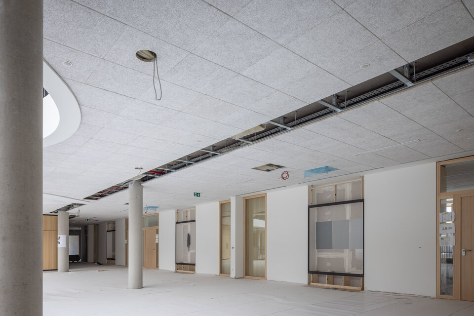 The fit-out included custom-built furniture, Lindner doors, ceiling claddings, and installed timber slats. These elements were integrated across a wide range of spaces including the auditorium, gymnasium, teachers' lounge, foyer, administration office, and classrooms. All installation work was carried out by the experienced Lindner Montage + Service Team, ensuring precision and contributing significantly to the architectural quality of the project. The result is an interior fit-out that harmonizes functionality, premium materials, and contemporary design standards.