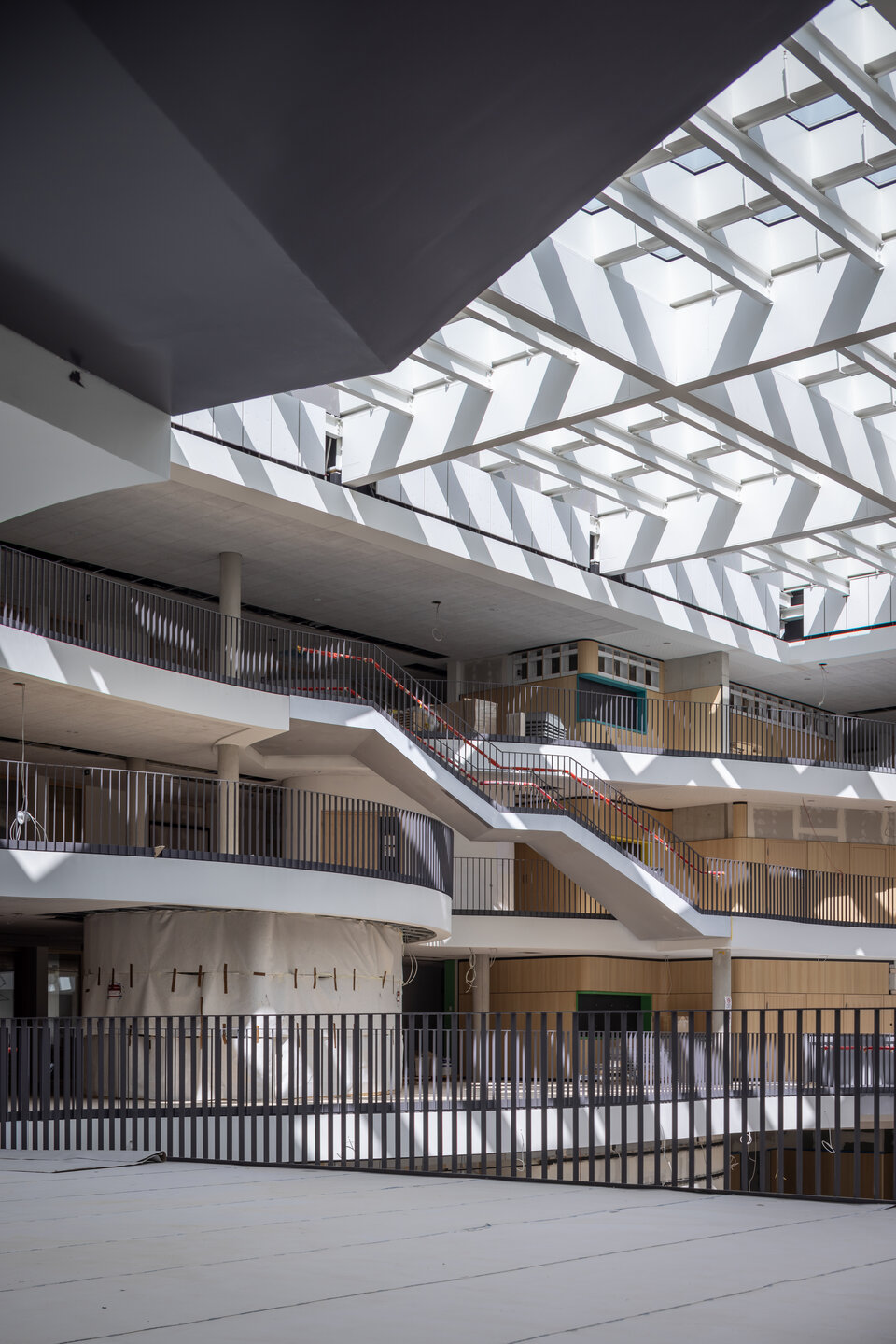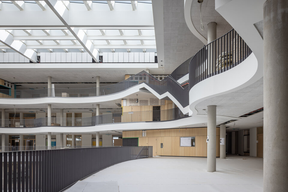The new extension is directly connected to the gym and sports field via a covered walkway. A striking architectural highlight of the project is the set of seven sculptural steel staircases, designed in a round-trapezoidal shape with alternating concave and convex treads—blending functionality with iconic design.