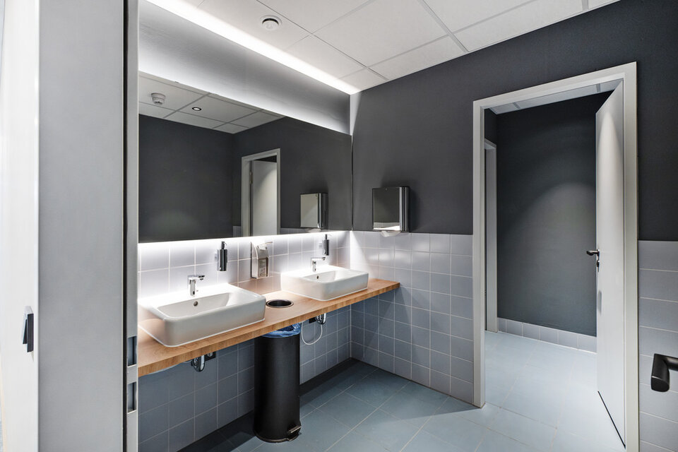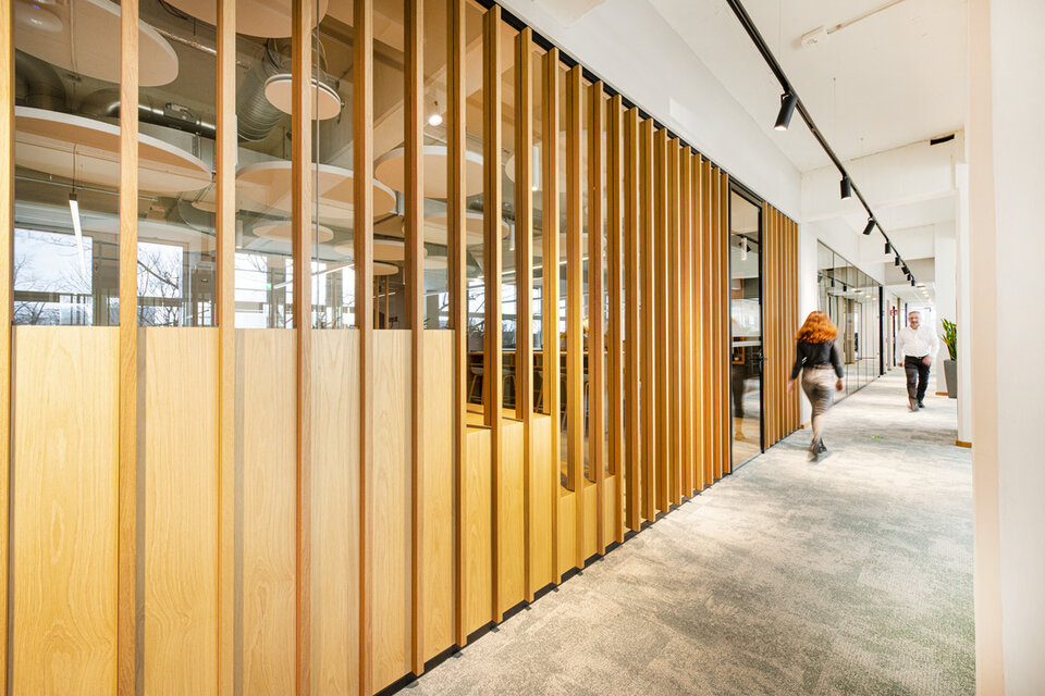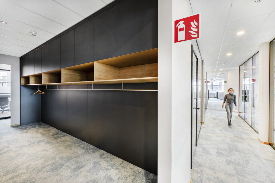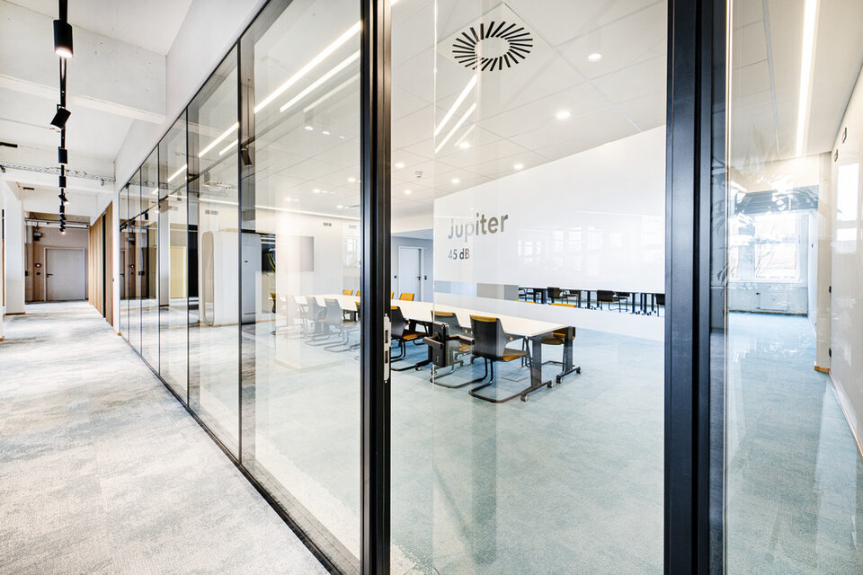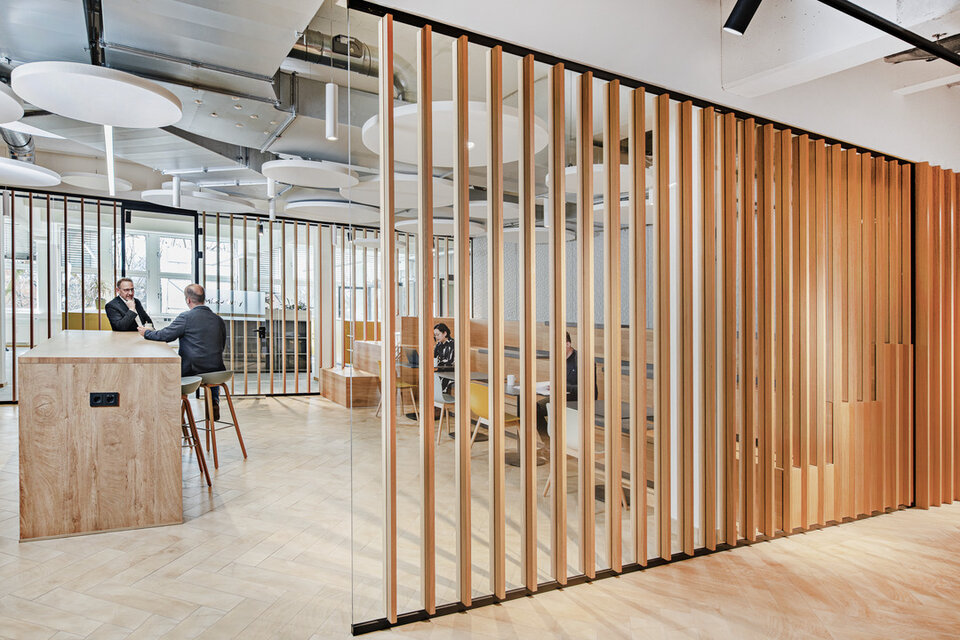 At the tenant fit-out, based on an office concept by Design2Sense, Lindner was involved with a variety of fit-out services. In addition to drywall work and acoustically effective ceiling canopies, Lindner supplied and installed glass partition systems and doors for separate office and meeting rooms. These are complemented by three different "telephone booths", including a CAS Room (a product development by Carpet Concept, Lindner and GiB innovative Bautechnologie mbH). The heart of the new office space, however, is the recreation room with kitchen and a staircase with seating possibility made of oak and a spatial partition of wooden slats to the open work areas. The cloakroom and other carpentry, painting and flooring work as well as the sanitary facilities were also provided by Lindner.