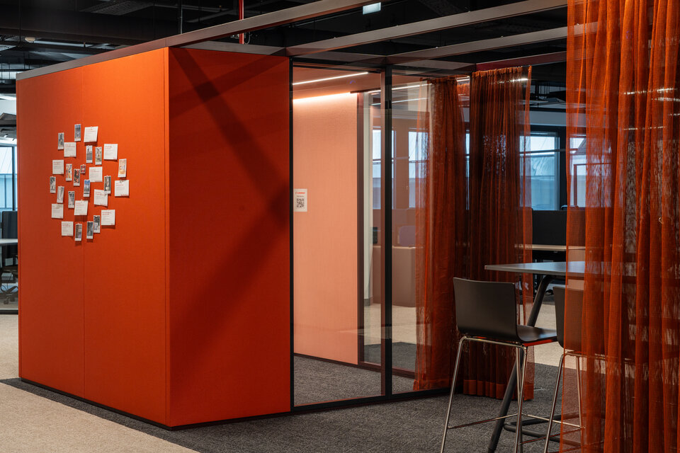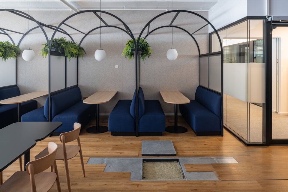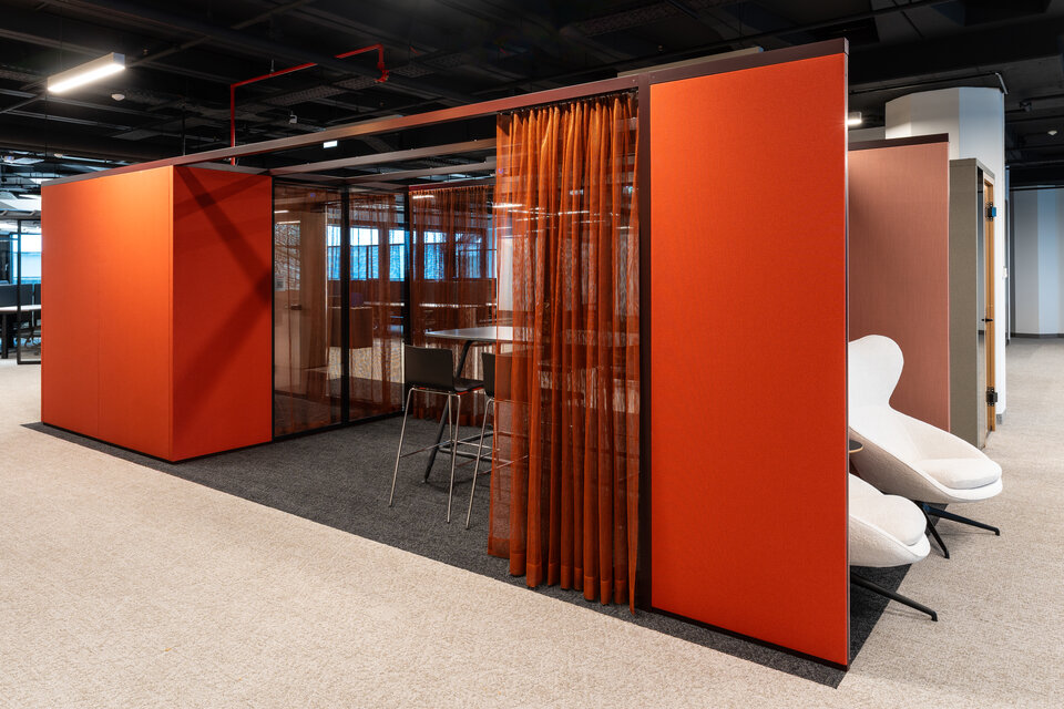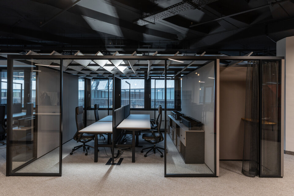 CAS Rooms Modular impresses with its modular construction, which allows virtually unlimited adaptation to different spatial requirements. CAS Rooms SET offers retreats for concentrated work, creating a pleasant working atmosphere through textile surfaces and natural materials. With CAS Rooms Flow, open areas are structured using delicate frames with curtains and integrated LED strips, providing both functional and design accents. In addition, CAS Rooms Free offers flexible zoning elements that are not only acoustically effective but also continue the project’s sustainability concept by making use of second-life materials.