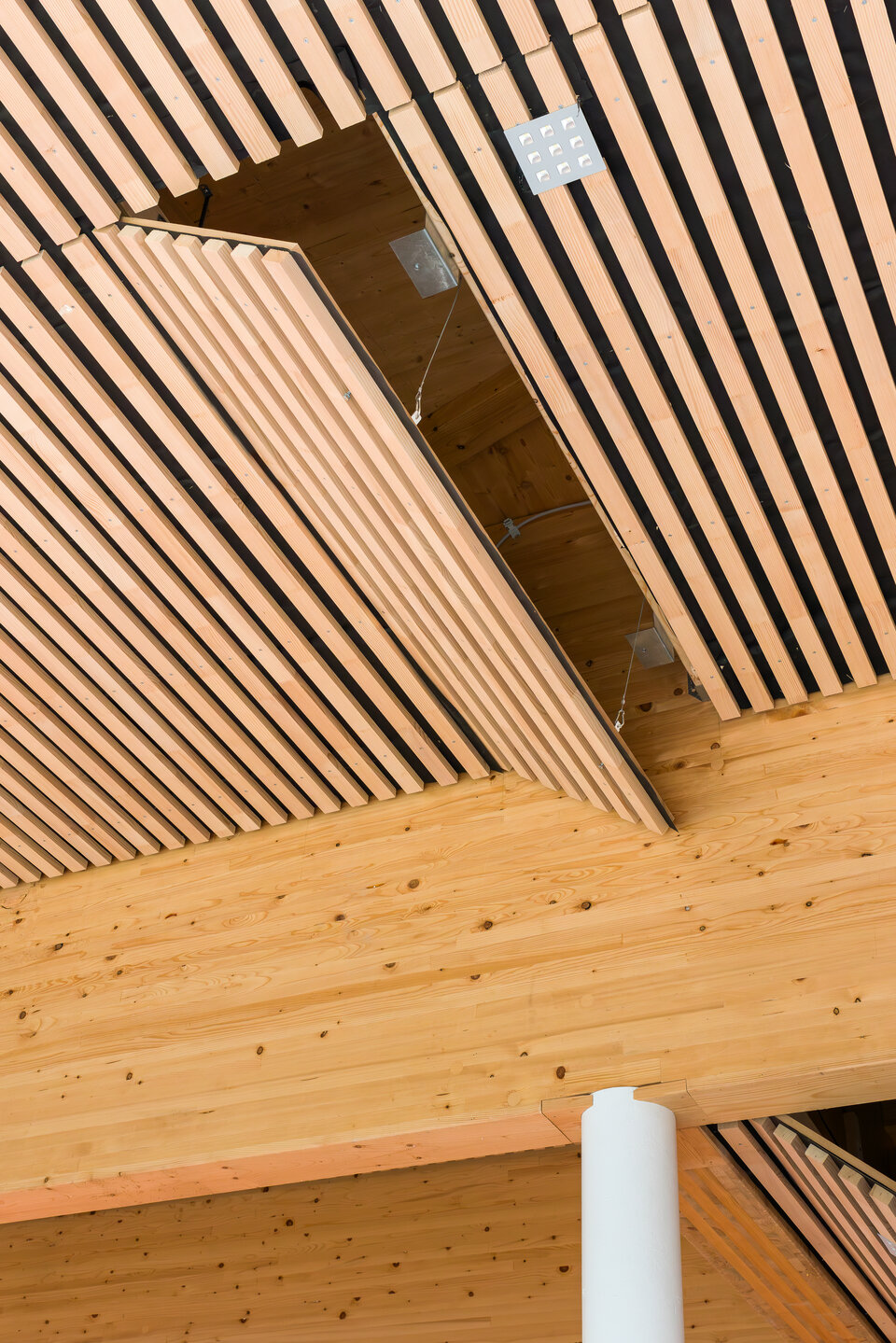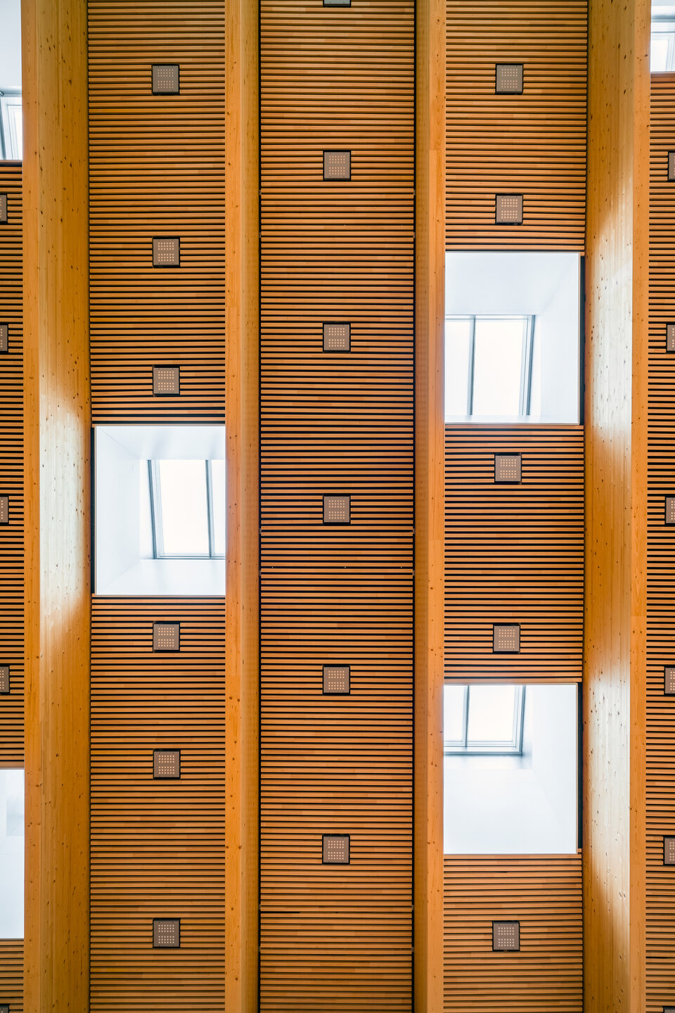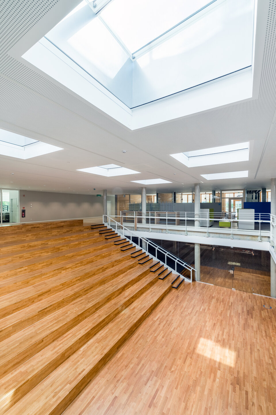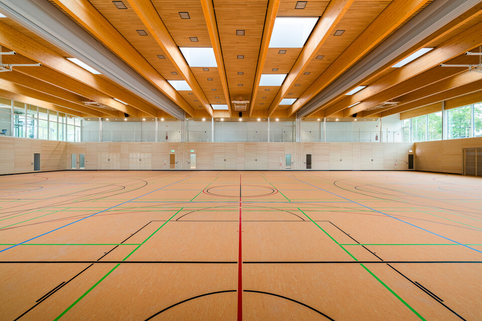 The Lindner Group was responsible for several aspects of this demanding fit-out project, including the installation of a wooden slat ceiling in the 6.5-metre-high sports hall, complete with integrated access panels and light shafts. Lindner handled the entire planning of the ceiling systems – including detailed construction and installation planning as well as structural calculations. Despite a tight schedule, implementation proceeded smoothly and was completed on time.