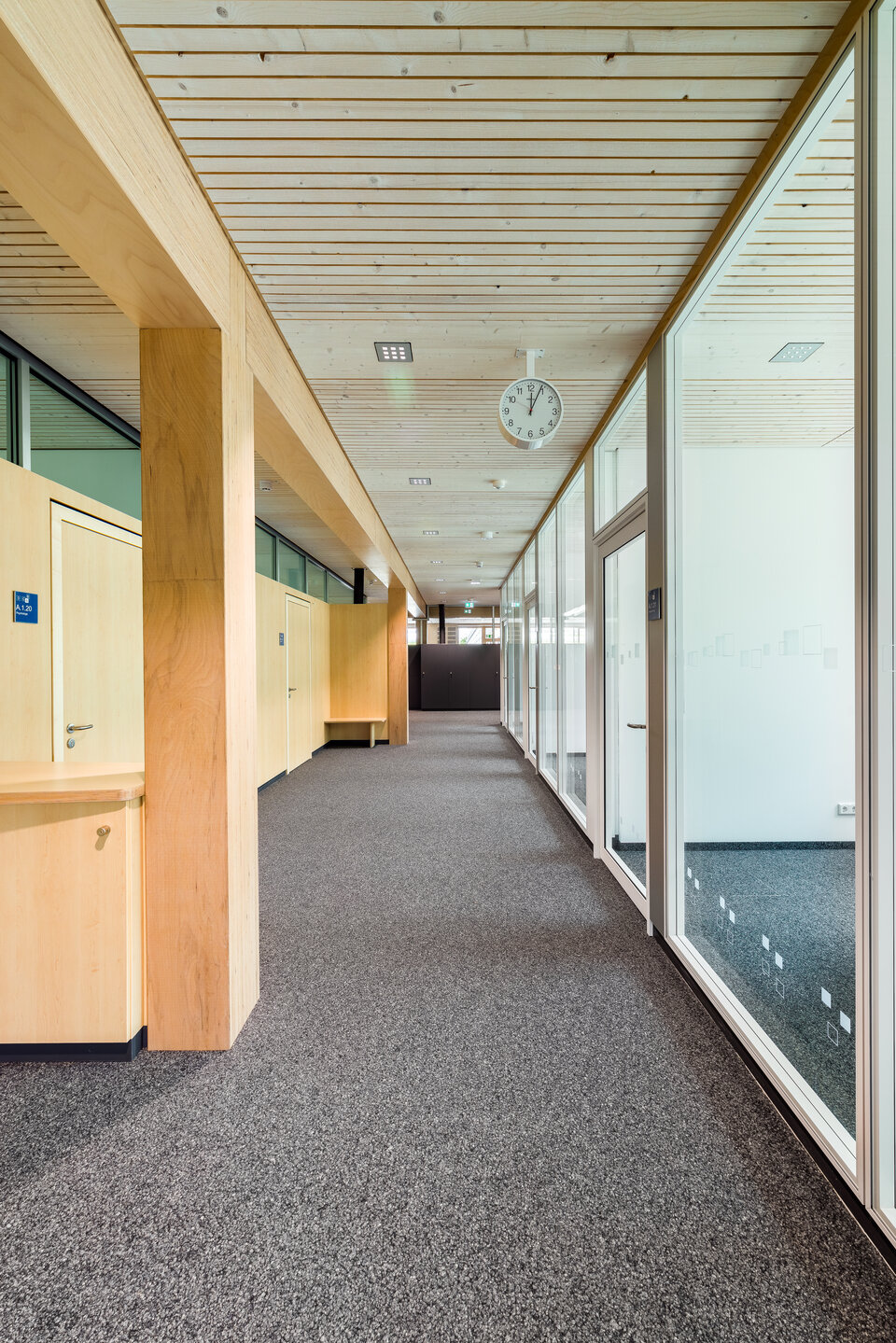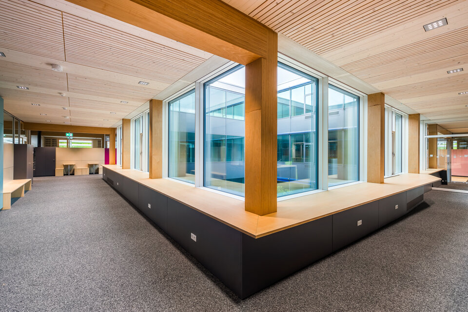 In the wall construction sector, Lindner carried out high-spec dry lining work and installed premium fire-resistant glazing. The combination of the Lindner Life Contour 126 glazed partition system and the Lindner Logic 100 Timber wooden partition – featuring integrated ATB 68 aluminium framed doors – creates bright, open interior spaces that promote transparency without compromising on sound insulation or safety. This results in areas designed for communication, focused work, and flexible learning formats – all tailored to the educational needs of a modern school environment.
