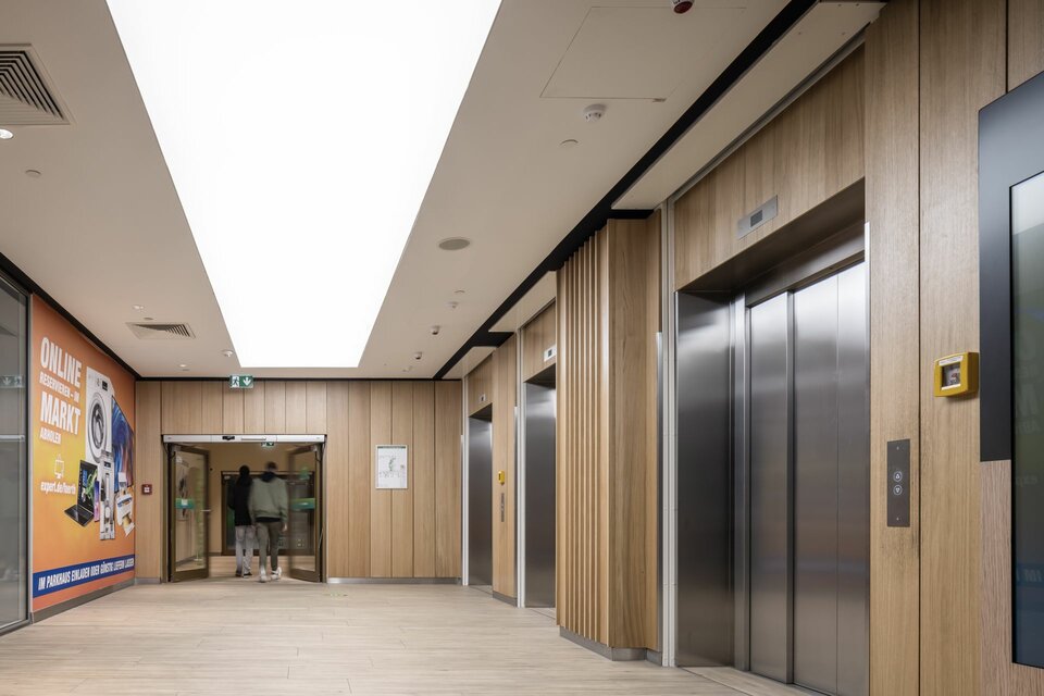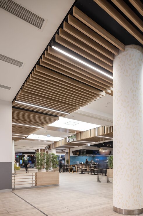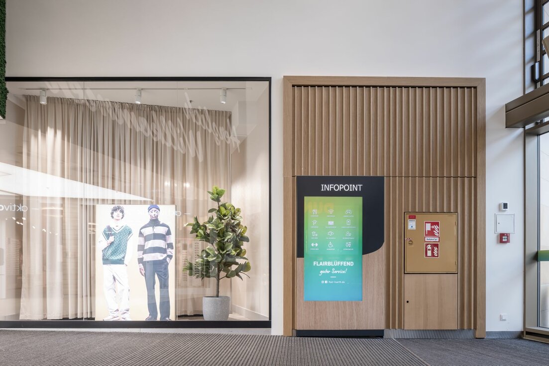 The FLAIR in Fürth is a shopping centre in a class of its own: numerous stores, restaurants and entertainment areas ‒ including Germany's largest virtual reality world ‒ await visitors there. In terms of interior design, the focus was primarily on natural materials such as wood, wood-look tiles, plants and mosses. Large skylights let the sun's rays into the interior of the building and create an inviting atmosphere: therefore, the shopping centre has developed into a meeting place for young and old since its opening.
