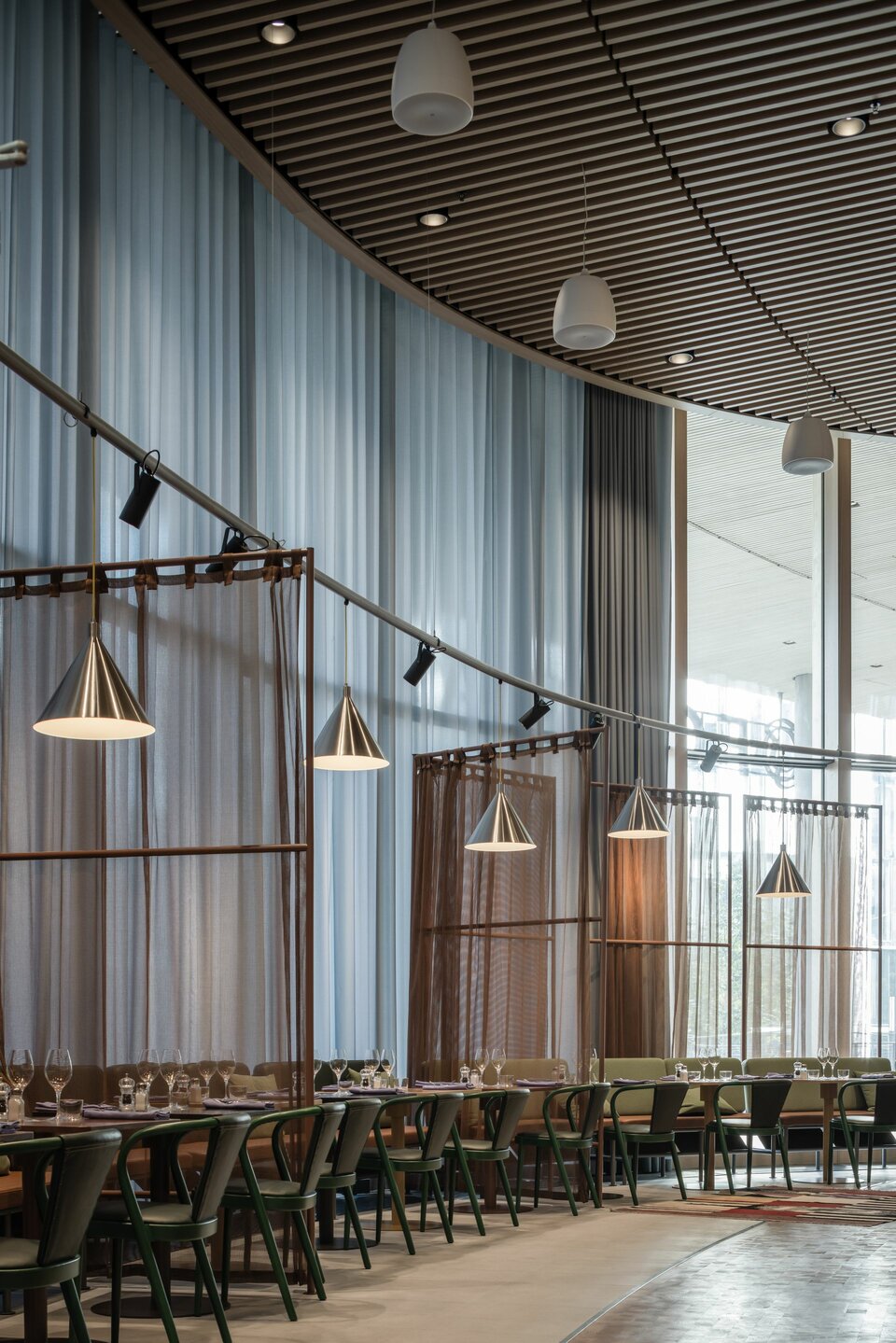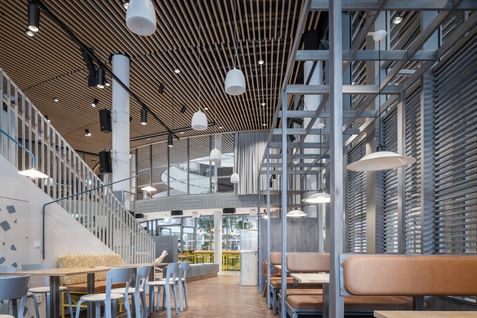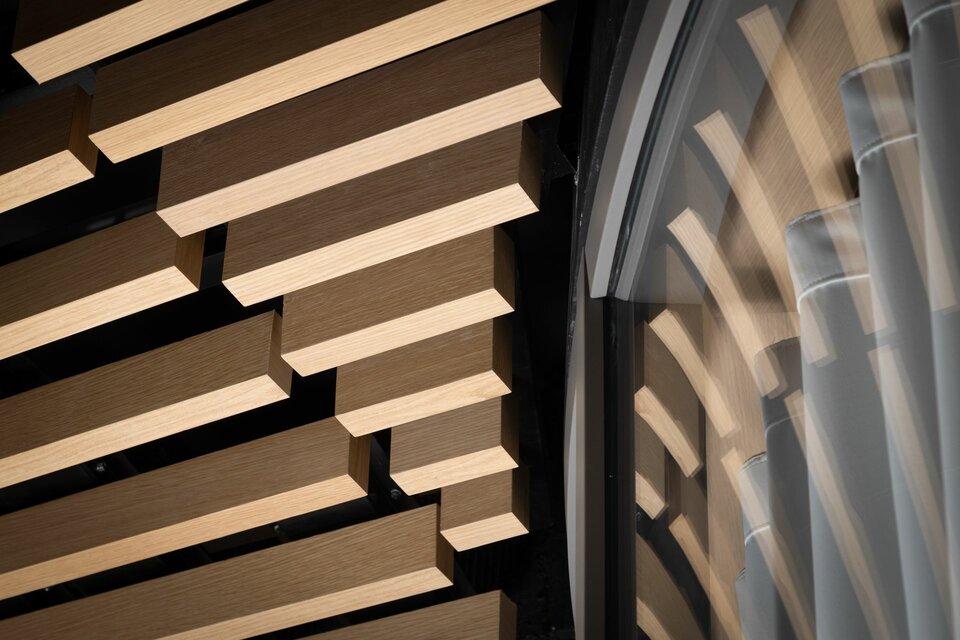 Particularly noteworthy is the RIBline Timber ceiling cladding, which offers a modern and safe finish with its elegant wood appearance and fire-resistant gypsum core. The system enhances the interiors aesthetically and stands out for its resource-efficient construction: the core is made from recycled gypsum. The combination of environmentally friendly materials and appealing design complements the architectural concept of Forskaren, contributing to the creation of an inviting environment.
