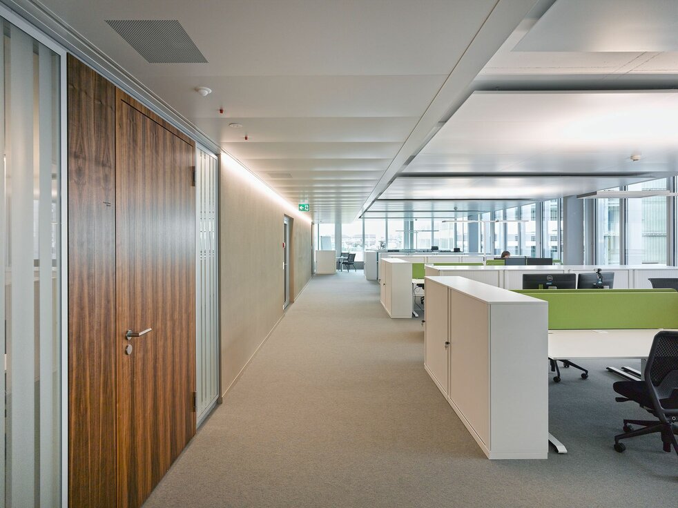 The interior concept of the offic buildings follows modern trends by mainly including open spaces. In this way, the buildings support better interdisciplinary cooperation, straight ways of communication and overall improved well-being of employees. Furthermore, the pillarless construction of the Office Building 1 allows for easy redevelopments in case differentiated demands arise. As a part of this project, the Swiss branch office of Lindner AG installed Lindner glass partition systems and door systems and executed dry construction works.