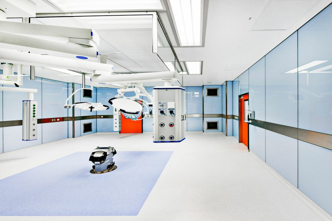 Through its Clean Rooms division, Lindner SE has contributed to the fit-out of the 14 operating theatres. With plasterboard walls, the rooms were delimited from the hallway, with access via sliding or swing doors. The swing doors were partially designed with T30 fire protection and also equipped with automatic door drives. Glass wall coverings were created in the operating theatres; a hygienic solution that seamlessly integrates the various installations such as ventilation units and screen inserts and hides the building services in a visually appealing manner. From a technical point of view, the overall requirement for all products was to ensure radiation protection of 0.5 and up to 1.5 Pb.