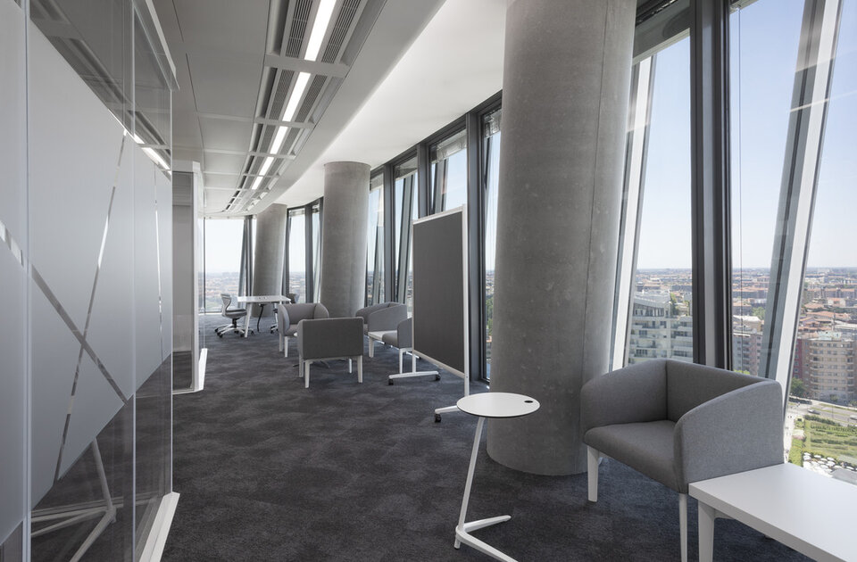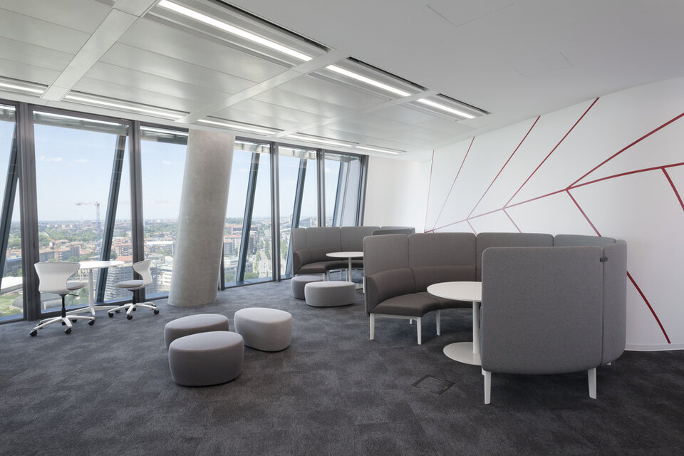 The tower was extensively equipped with Lindner raised floors of the NORTEC type. This solution made it possible to cleverly conceal technical installations and cable routes in the floor cavity in order to gain greater architectural freedom. Suitable outlets were created in the required places. Furthermore, the floor can be opened at any point, which facilitates maintenance work. An attractive finish is achieved with floor coverings applied on site.
