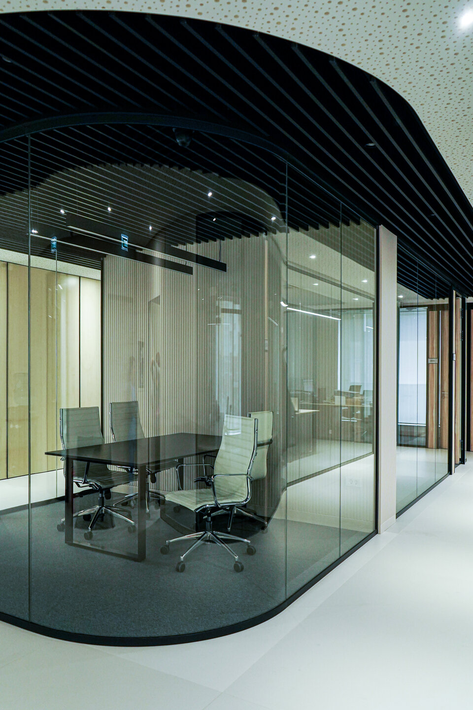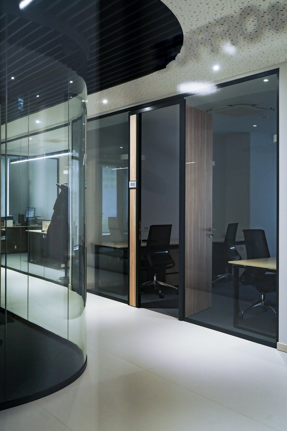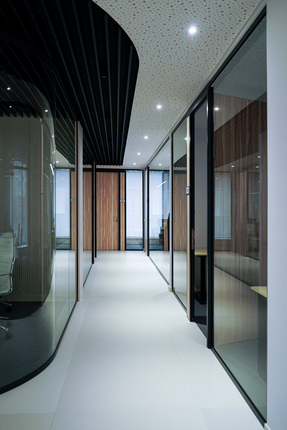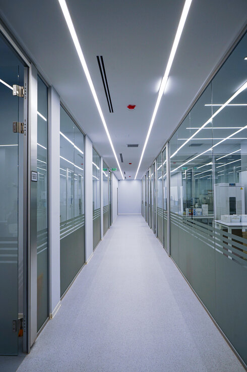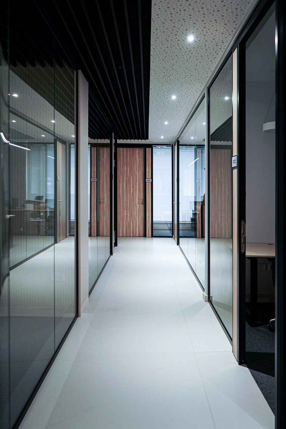The Lindner Group played a key role in the development of the office and laboratory spaces. To ensure an open, bright, and flexible office layout, floor-to-ceiling Lindner Life Pure 620 partition walls with single glazing were used. Thanks to their modular design, they can be easily repositioned, allowing for flexible space utilisation. Matching floor-to-ceiling wooden doors complement the high-quality office design and provide a productive working atmosphere thanks to sound insulation.