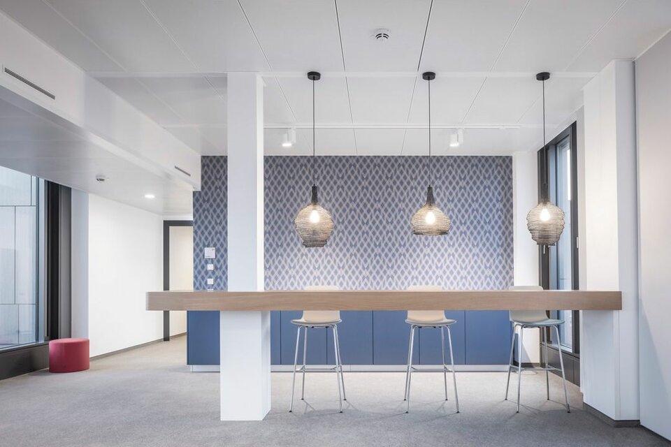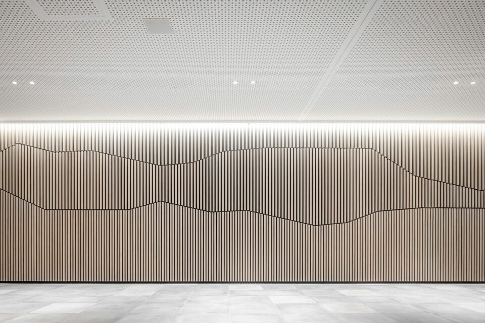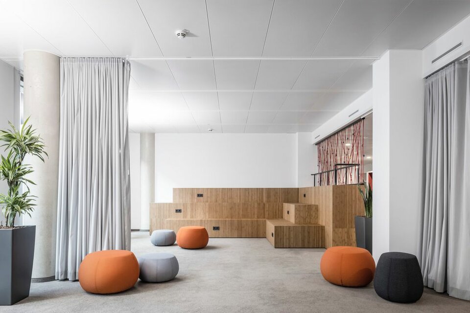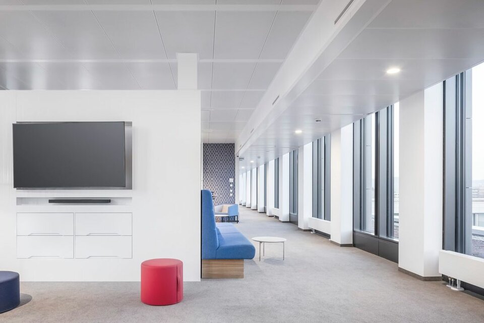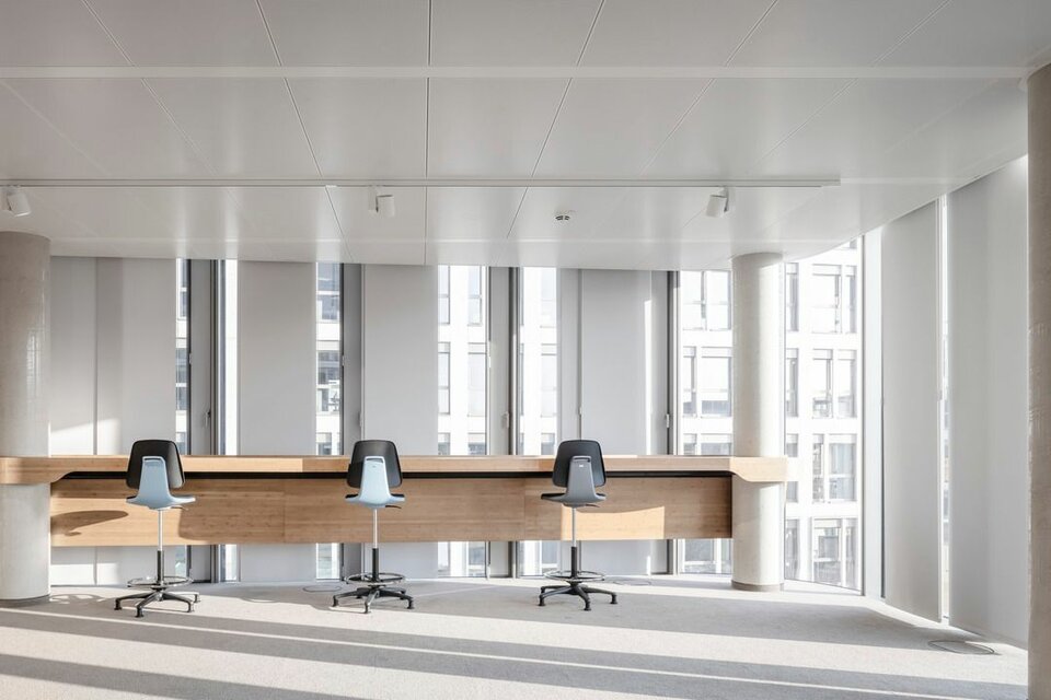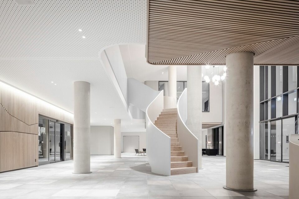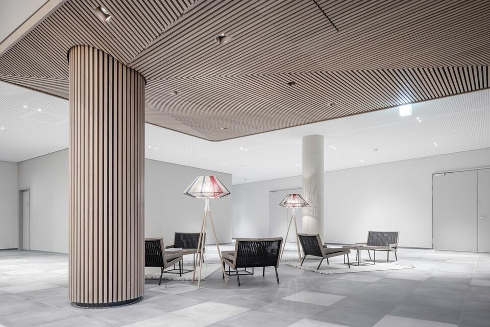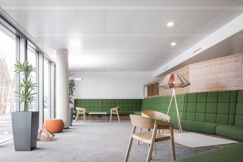 The new administration building impresses with a sensible, modern room structure, generous communication areas and social rooms as well as an auditorium with 500 seats. Lindner Objektdesign and the Fit-out Division for Central-Eastern Germany developed, delivered and installed numerous special solutions as well as high-quality ceiling and wall coverings, e.g. in the entrance area, canteens and tea kitchens as well as in the auditorium. Further office and working areas were equipped with sustainable and energy-efficient Lindner system products for ceilings, floors and partitions.