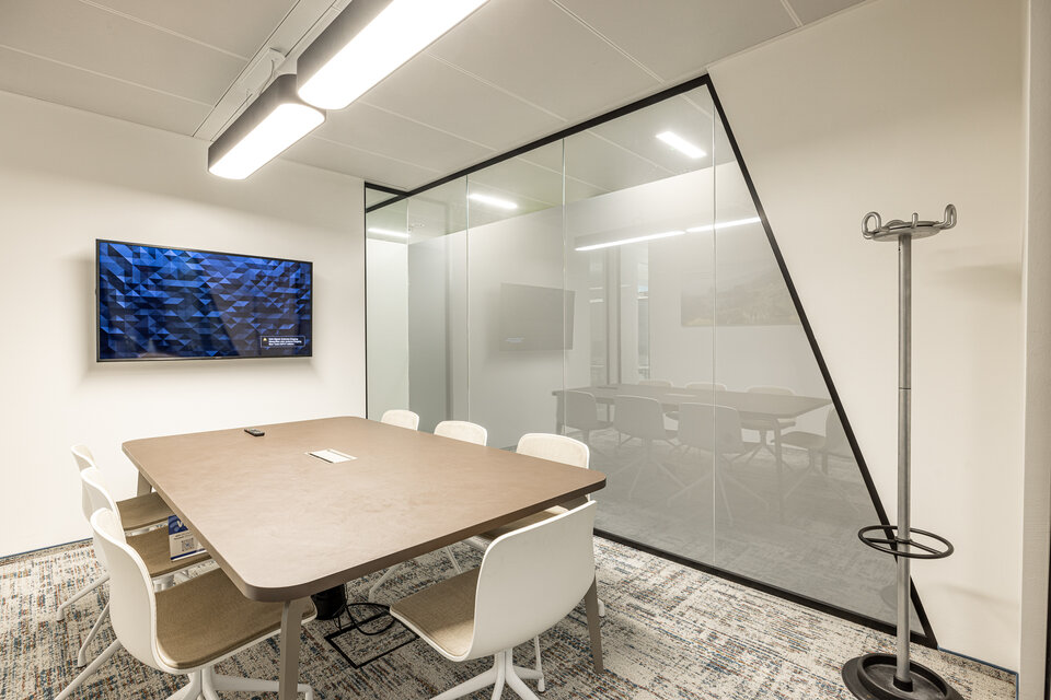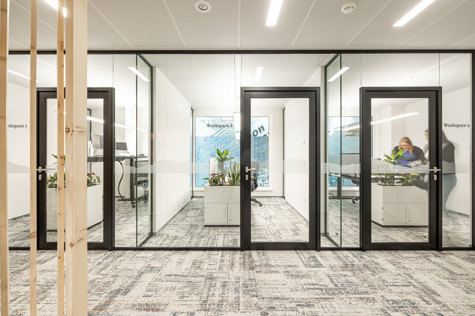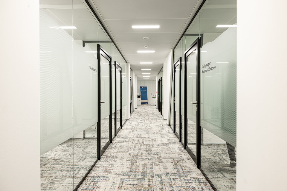 To divide the rooms, the Lindner Life Pure 620 glass partition system was used. A special feature: the system was fitted with a frosted film that can switch between transparent and translucent via electronic control.