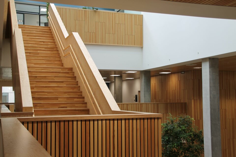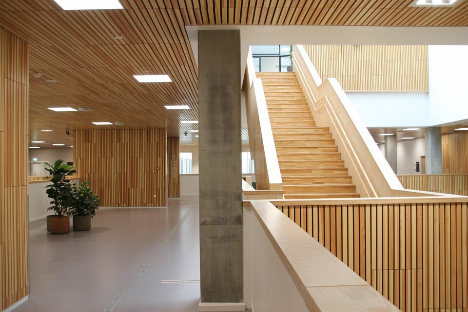 As part of this project, the Lindner Group supplied the RIBline wall and ceiling claddings: a total of 1,434 m² of ceiling panels and 1,054 m² of wall panels were installed. RIBline represents an optimal solution that combines aesthetics, environmental responsibility, and the highest safety standards. The system features a wood-like appearance that lends a natural and warm atmosphere to the space, while the fire-retardant gypsum core ensures enhanced fire resistance.