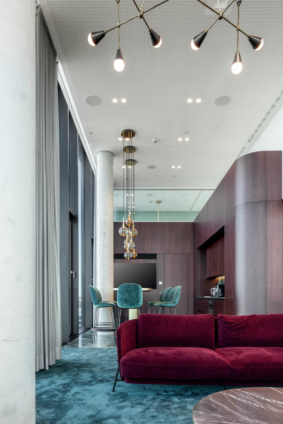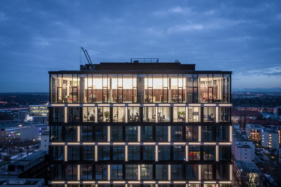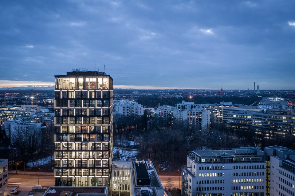 Directly behind the Ostbahnhof in Rosenheimer Straße 141 e-h, the HIGHRISE one, a 17-storey new office building was built with a special lightness of construction, emphasized by an open, transparent façade. The vision of the HIGHRISE one is to create an efficient and harmonious working environment. That's why great attention was paid to the details. All current office concepts can be implemented on a total 19,000 m² of office space in the base and in the tower. In order to create an efficient working environment, the meeting rooms and other meeting places have been centrally located and the workplaces have a view to the outside. One floor in the base area measures about 2,200 m², in the tower about 740 m².