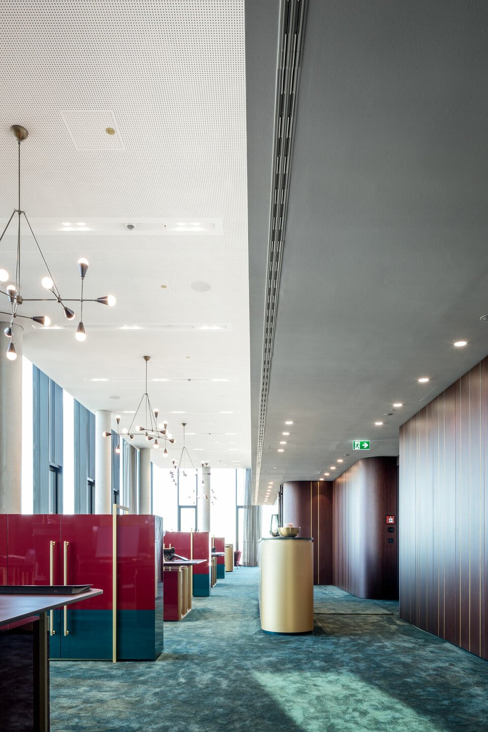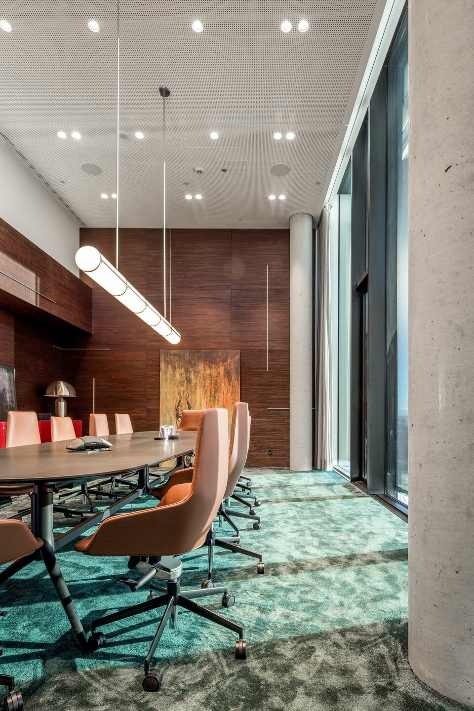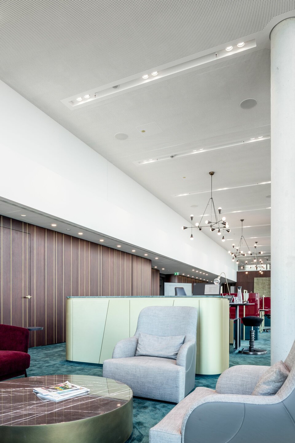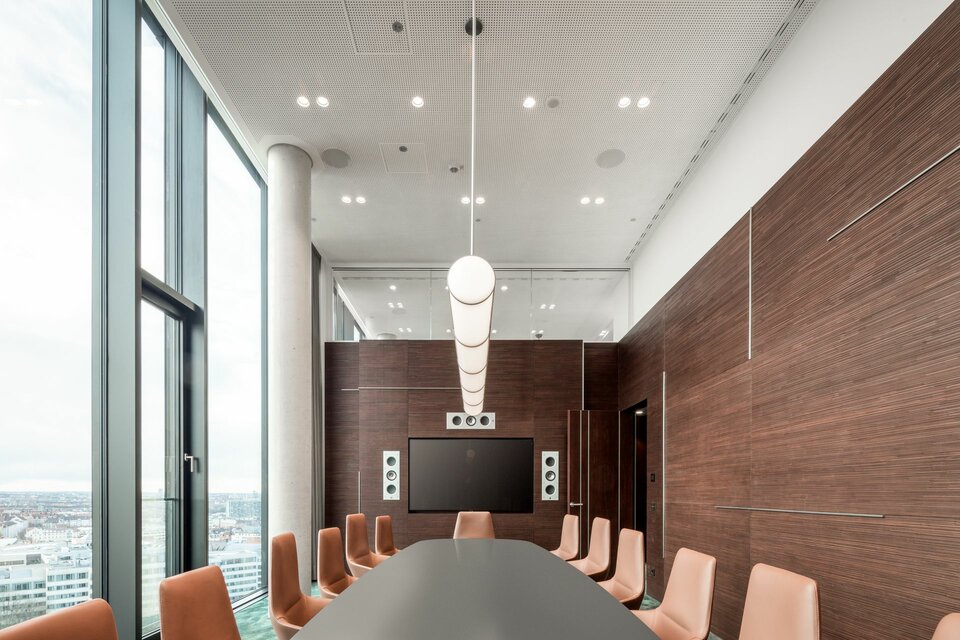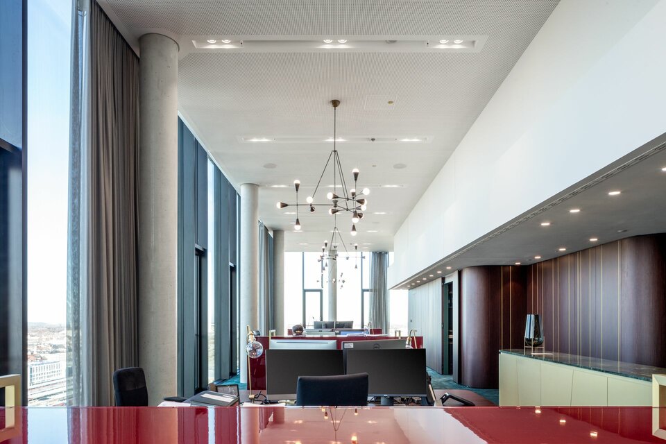 Lindner contributed to the HIGHRISE one with heated and chilled ceilings and insulation work for building services. Thus, an efficient solution for the temperature control and acoustic regulation of office spaces with minimal energy losses was supplied from a single source.
