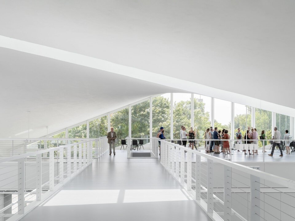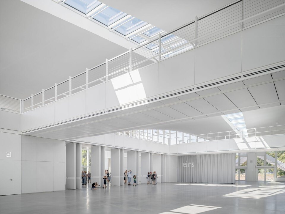 The Lindner Group made a significant contribution to the refurbishment of the Hyparschale with high-quality construction elements. The LMD-E 213 hook-on ceiling with emphasised joint blends perfectly into the modern design with its homogeneous ceiling surface. The tool-free revision enables easy installation and maintenance of the cable routing behind it.