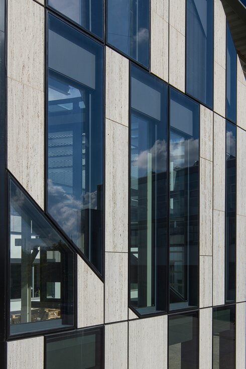 The facade blends into the building´s extraordinary design, which is a mixture of straight and wavy lines. Behind the interaction of the almost white, roman travertine and large-scale glass panels, a skillfully hidden modular structure can be found. The diverse order of elements creates complex patterns which draw strong visual connections to the "neighbourhood" of the respective building sections: The soft shapes of the horizontal facade mirror the neighbouring theatre and underline the dynamic look character of the Schadow square and Gustaf Gründgens square. At the same time, planted areas in the vertical facade facing the Königsallee (King´s avenue) and the Hofgarten emphasise the meeting of city and nature. Due to the wavy shape of the structure, a lot of angles can be found in the mullion - transom construction. In order to create identic frame view both inside and outside of the building, a special fulcrum was chosen for the profile connection.