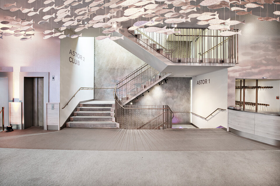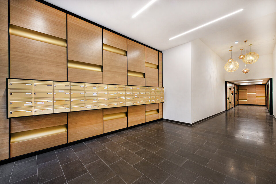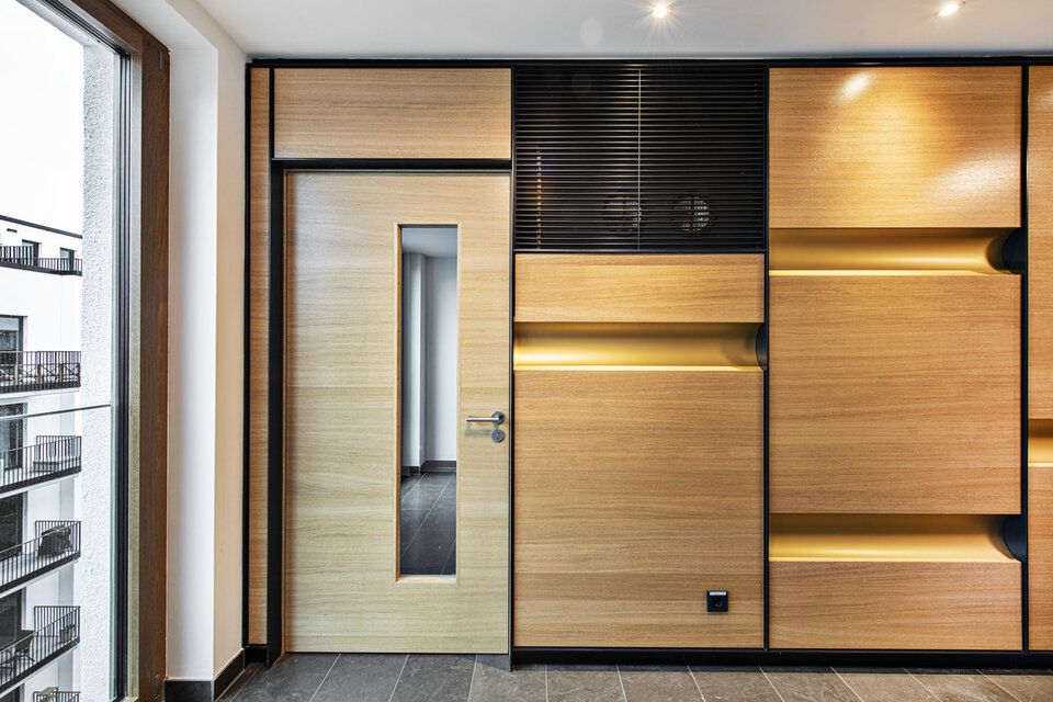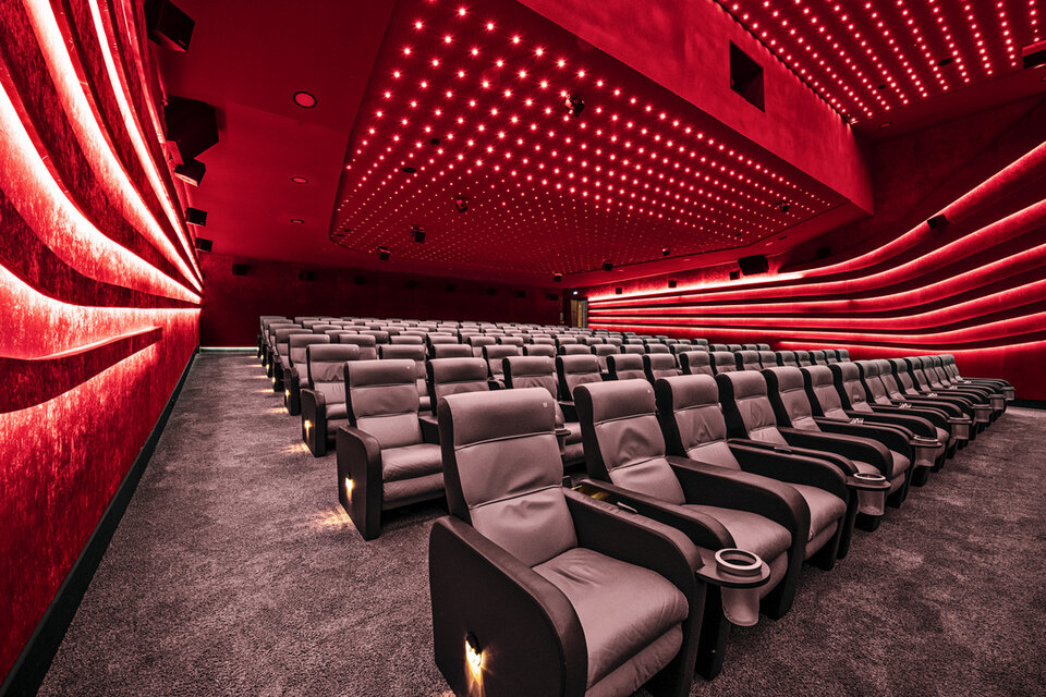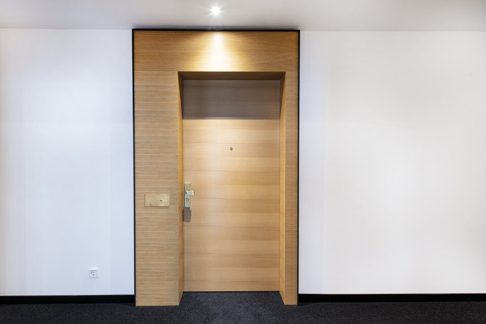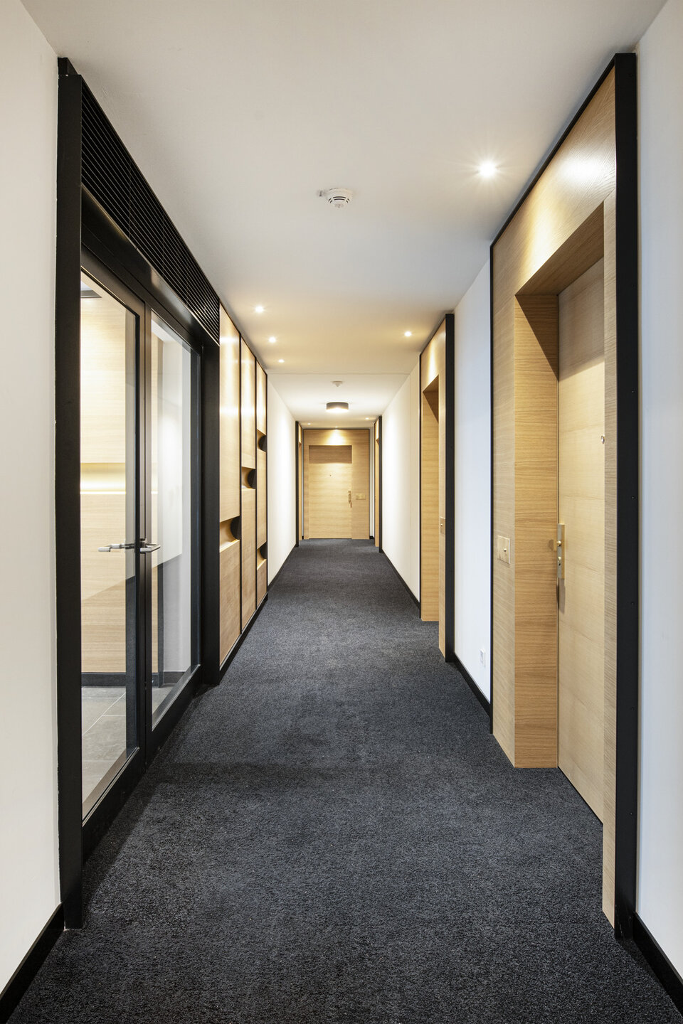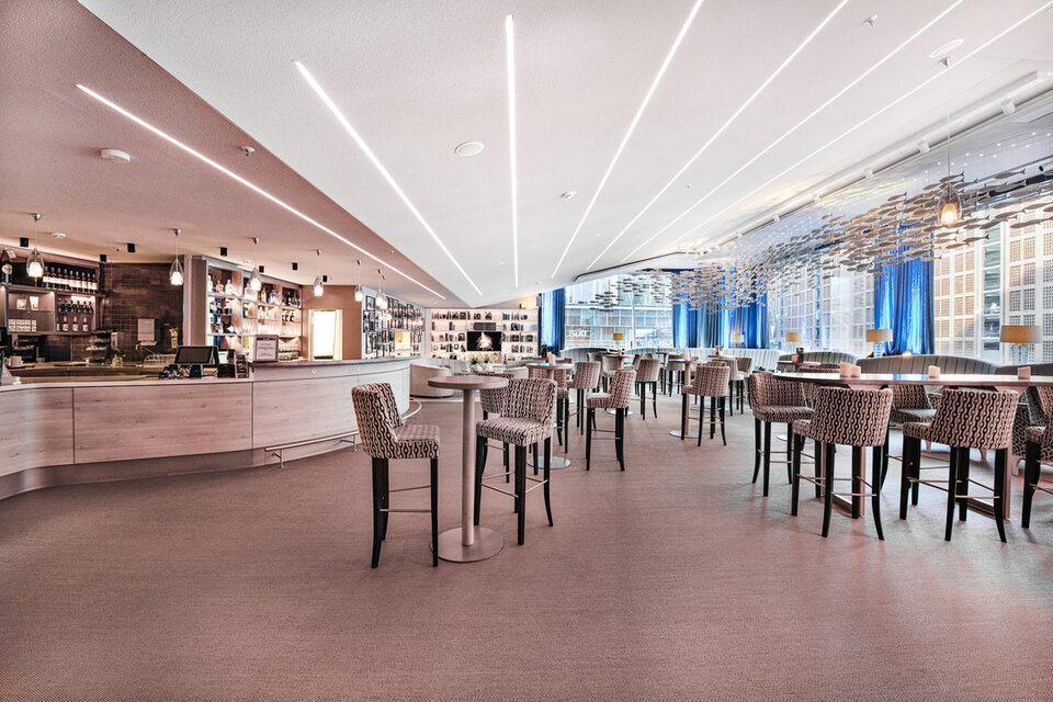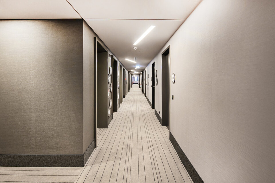 The Lindner Group was involved with an extensive range of interior fit-out works. The focus was on drylining including painter, paperhanging and varnishing works, Lindner ceiling and floor systems, window installations, high quality fire protection wall cladding as well as various object doors. The fit-out package included a large number of custom-made products such as golden-coloured postbox systems or oak apartment doors with a black-coloured steel edging. High quality materials and accurate processing were also very important in the hotel area, e. g. in the wall design in the hotel bar with elaborate spatula technology. The Lindner Team constructed rising floor systems with a height difference of up to two meters and a maximum inclination of 6.4 degrees in the event rooms and the auditoriums of the adjacent cinemas. Besides special solutions, Lindner installed almost 40,000 m² of drylining elements, embellished 80,000 m² of partitions and ceilings, supplied 88 windows, 382 steel doors and 1,500 wooden doors as well as partition walls/doors for sanitary areas within a period of one and a half years.