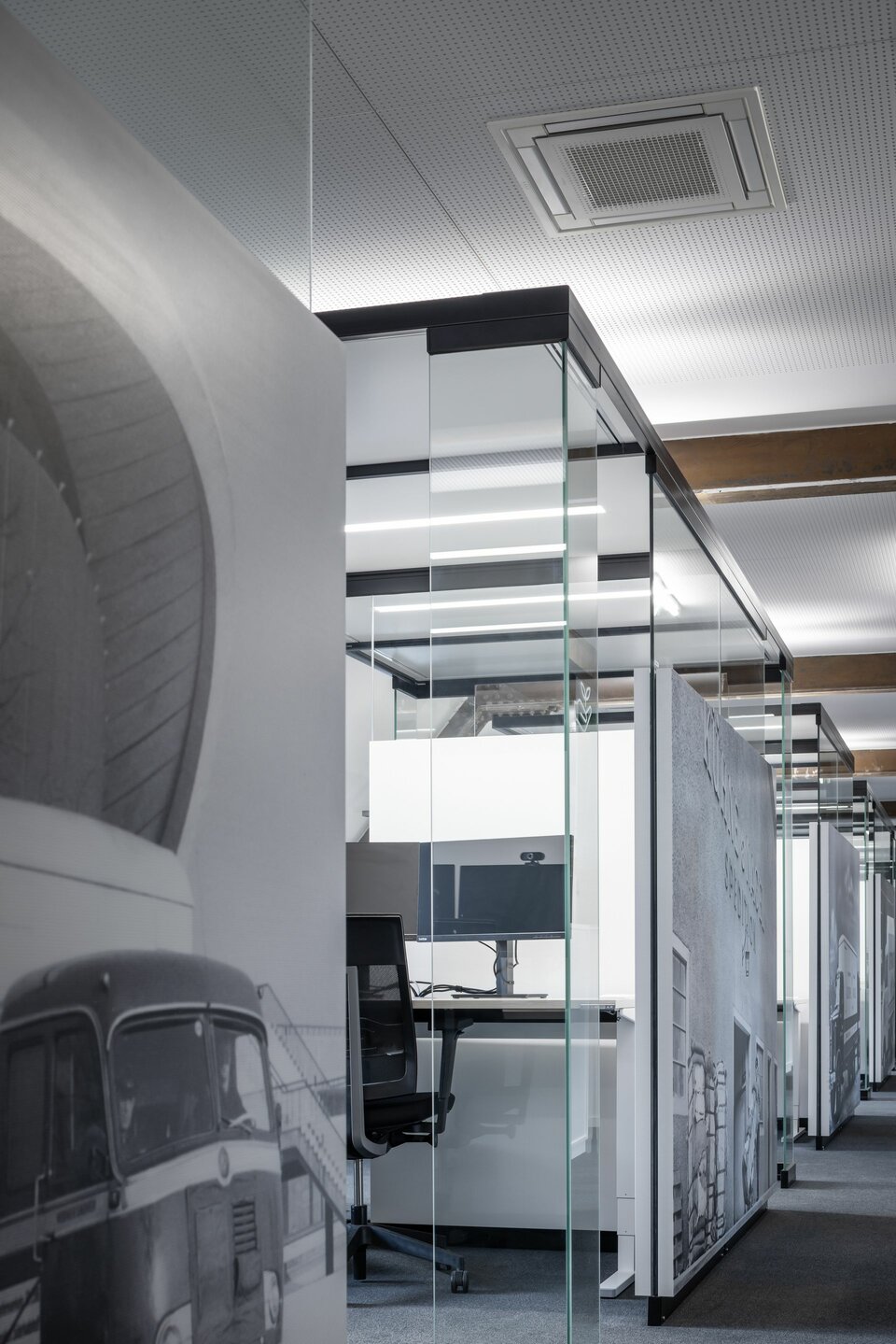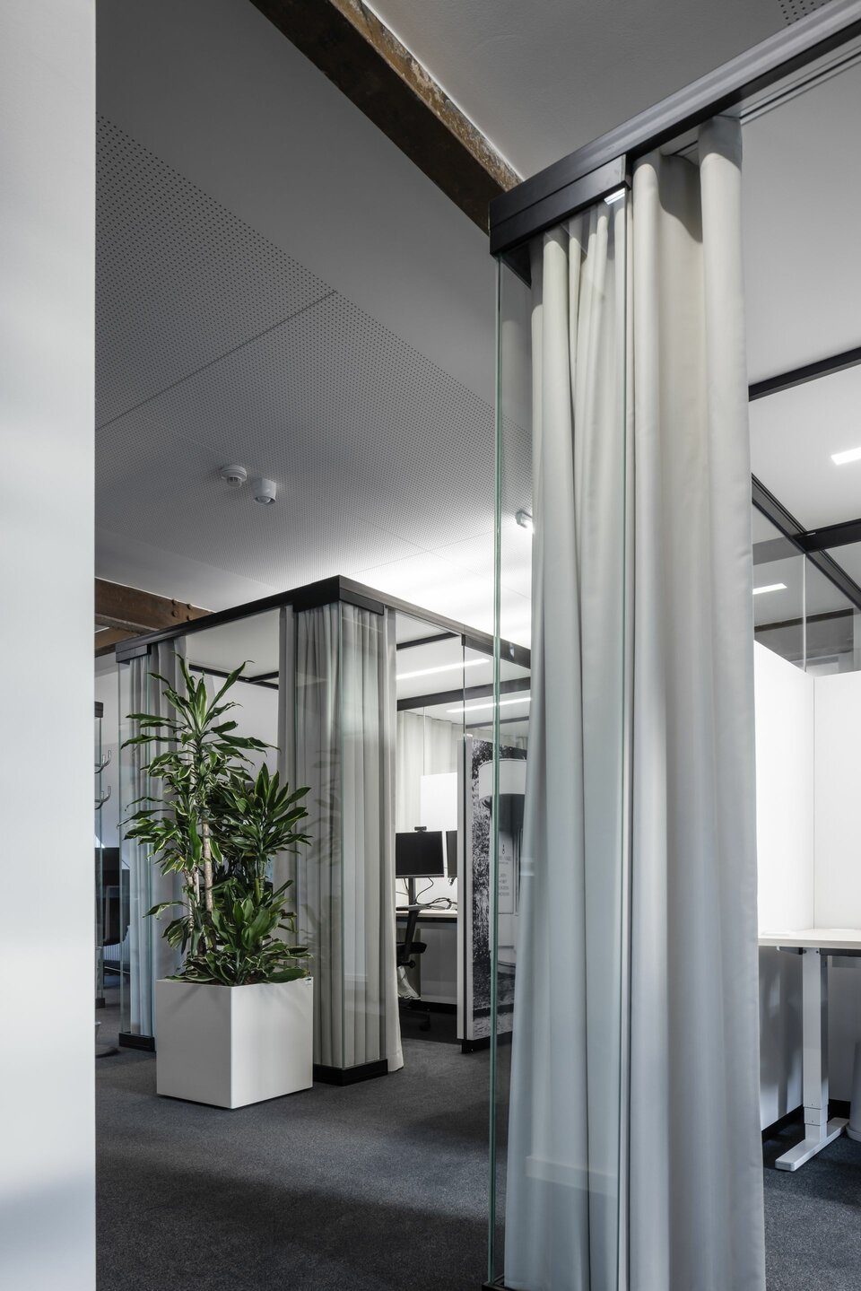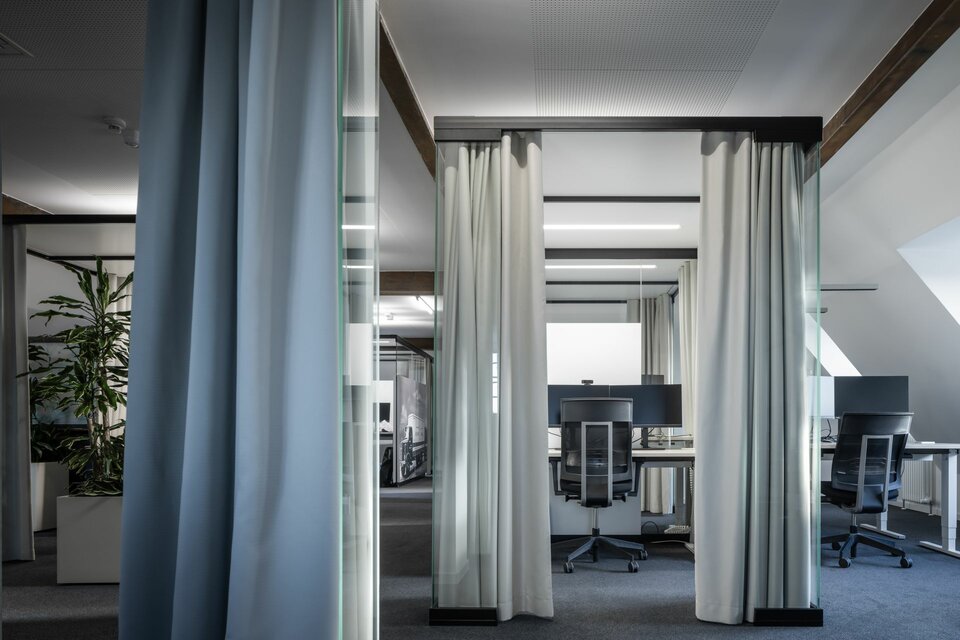 During the interior design process, existing spaces were transformed into modern work areas. Lindner was part of the interior fit-out with its own wall systems. Elegant system partition walls with printed absorbers not only serve as room dividers in otherwise open areas, but also improve room acoustics and provide a harmonious design thanks to their absorbers. The Lindner FLEXShell also made its way into the building: Without any connection to the ceiling or floor, the room-in-room system creates flexible workspaces and retreats for employees. Equipped with acoustic optimisation and dimmable lighting, a pleasant working atmosphere is created.