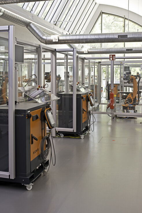 In order to provide this level of support in the north of Germany, KUKA set up a branch office in Braunschweig. Furthmore, an in-house training facility is used to teach future users of KUKA systems the correct manner of operation. This training facility and the adjacent administration areas were fitted with Lindner hollow floors. One of the main advantages of hollow floors is their ability to discreetly hide technical installations in their hollow space. The training facility - fitted with 24 robots - profited largely from this quality. Apart from their corresponding technical installations, these robots are not an easy burden to carry. For this reason, the especially powerfull system FLOOR and more® power was chosen for this project.