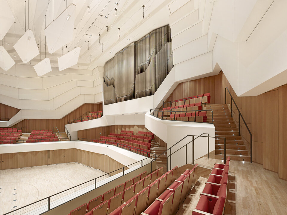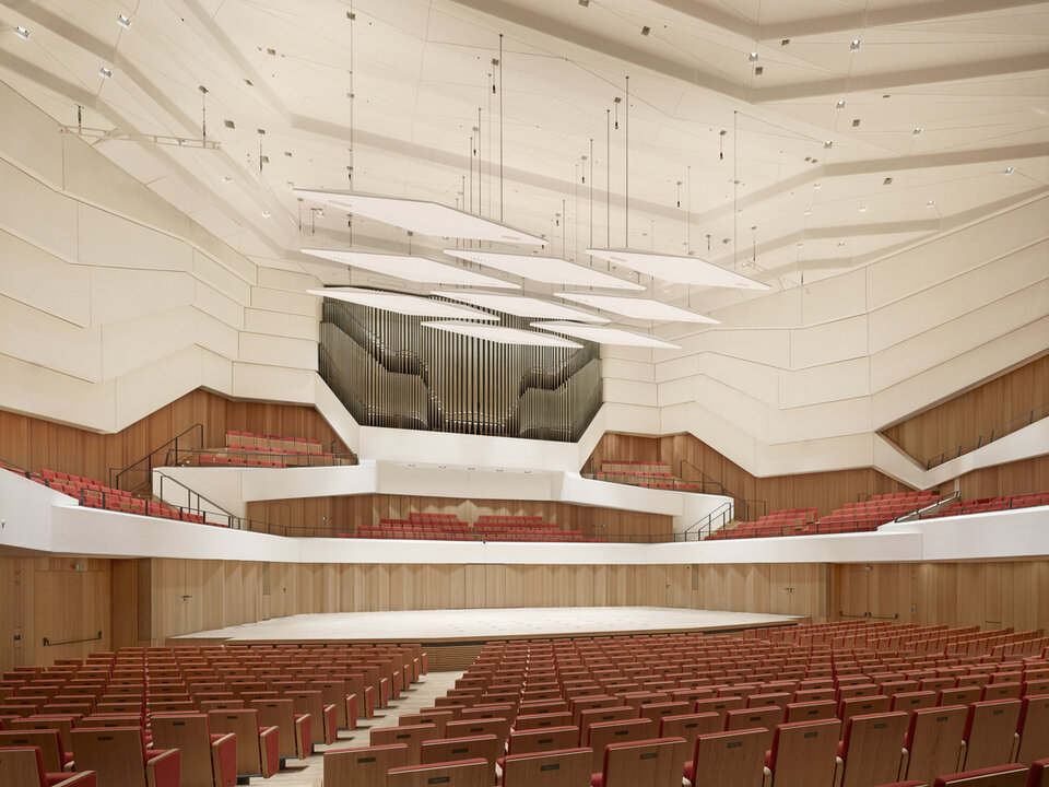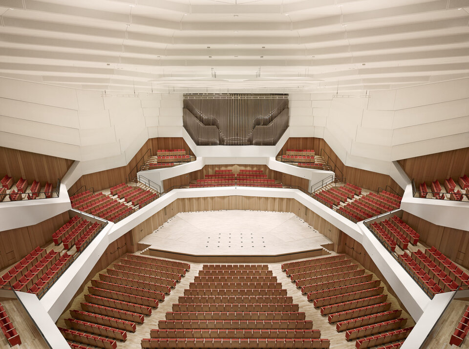 Lindner AG was responsible for the fit-out and the coordination of all works incl. building services and stage equipment of the concert hall, the cabaret hall as well as for the restauration of the heritage-protected Mogi Ceiling in the Foyer. What followed was an immediate involvement in the project right after the closure of the contract, where Lindner carried our the complete production and installation planning as well as the engineering in 3D models for the concert hall. As a preparation for the redevelopment, Lindner Gerüstbau GmbH was contracted with the construction of 21.500 m³ of complex scaffold structures. Within 18 days, about 110 tonnes of scaffolding material have been installed under sophisticated circumstances. The steel substructure of the hall was cladded with specially-folded triangular gypsum fibre panels. As to the walls, both gyspum fibre systems and fire protection claddings with real-wood veneer of type FIREwood have been installed. The floor system of choice was the specialised FLOOR and more® arena. The ground floor houses a completely decoupled cabaret hall, for which Lindner developed an acoustically effective expanded metal wall and ceiling cladding and supplied further ceiling claddings as well as custom doors. The contract for the faithful restauration of the monolithic gypsum ceiling (Mogi) in the foyer could be put into practice thanks to the finding and further development of original templates.