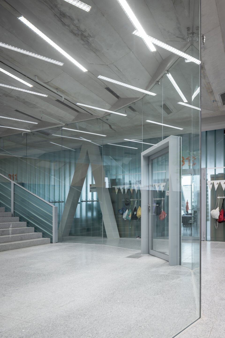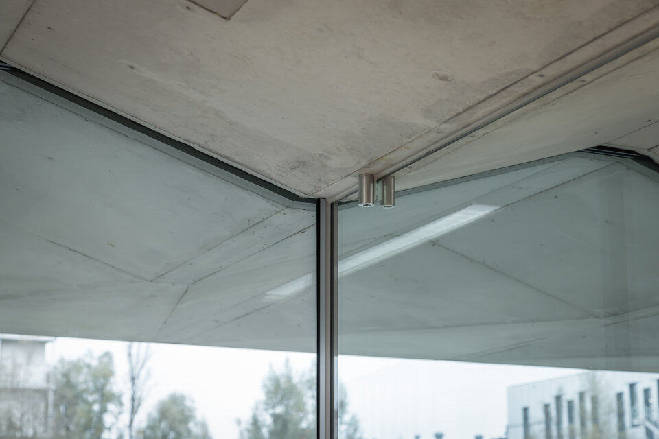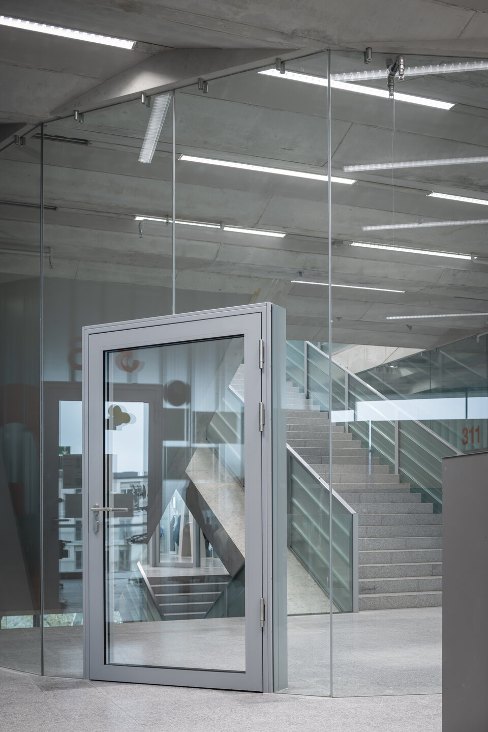 The Swiss branch of the Lindner Group took on key construction tasks for this project under particularly challenging conditions. Lindner’s focus was on the fitting out of the stairwells with glass elements and freestanding tubular frame doors: Lindner Life Pure full-glass walls were custom-made as a special solution without visible profiles. Instead, a point suspension system was used on the ceiling and a hidden connection in the floor area, which meets both the desired glass-concrete look and earthquake safety requirements.