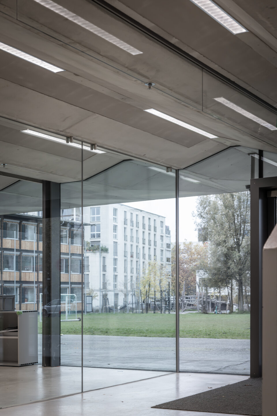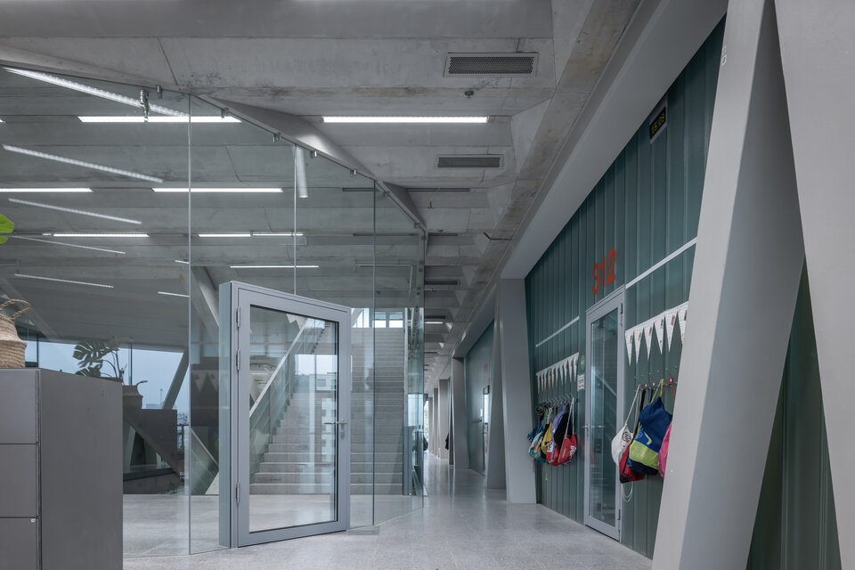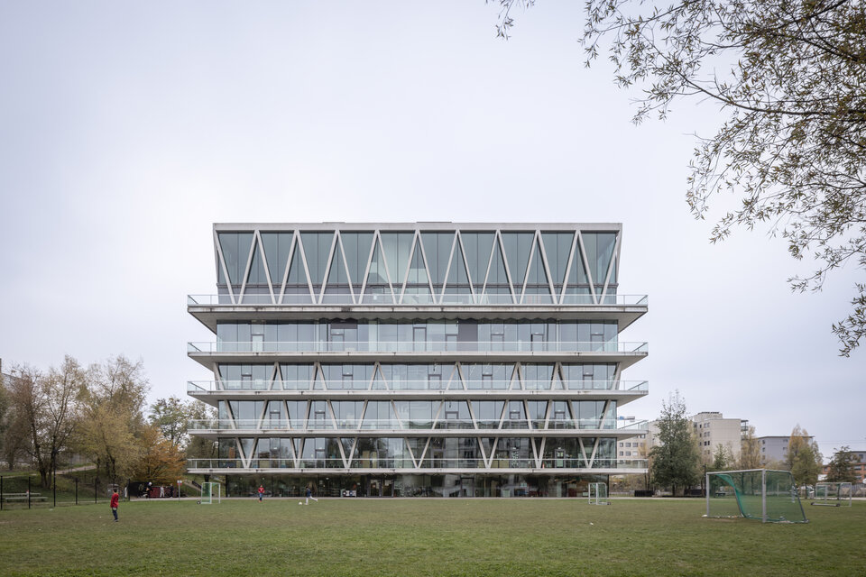 With 22 classrooms, a double sports hall, a multifunctional room, a canteen, a kindergarten, and various workshops, the Leutschenbach School building in Zurich, built in 2009, is one of the largest in the city. Unlike the classic, horizontal structure of many schools, the rooms here are stacked vertically within a compact building block across three floors.