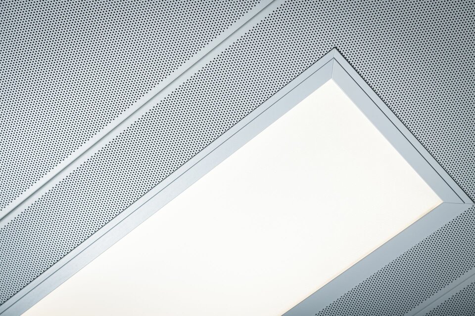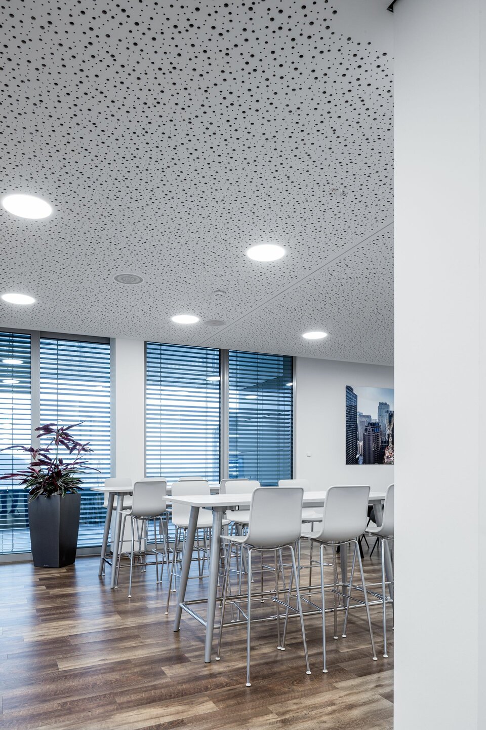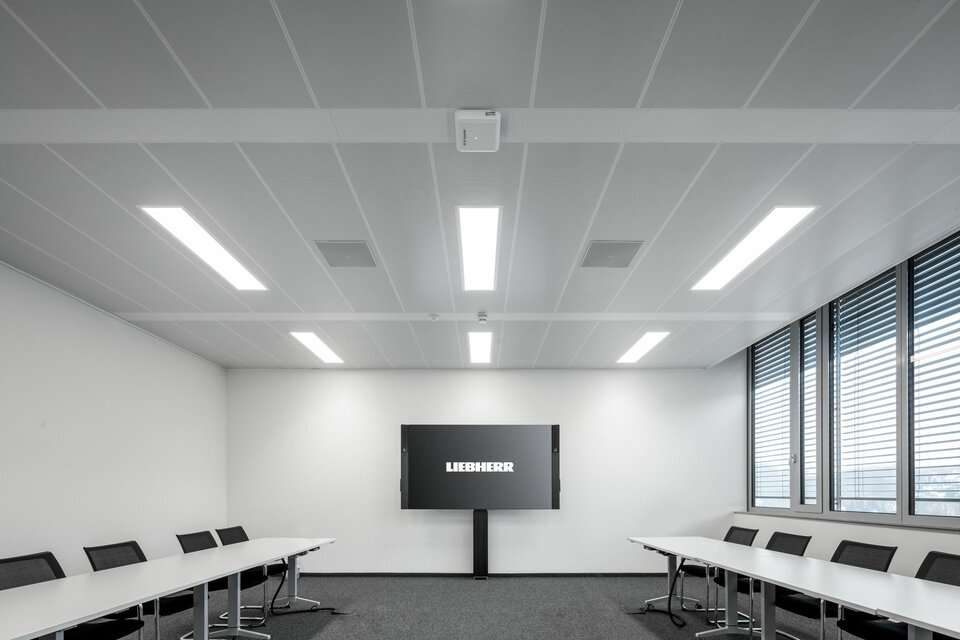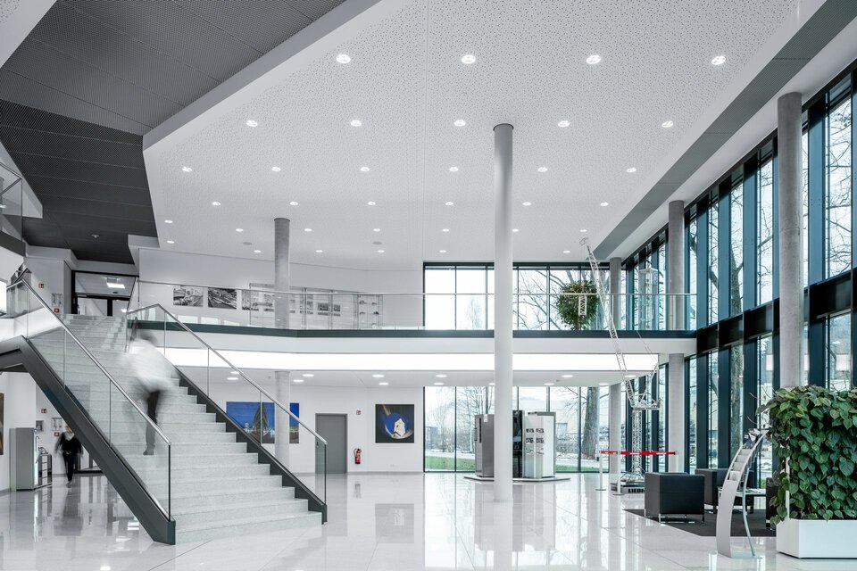 The Lindner Group implemented about large quantities of post cap ceilings in the office spaces of the new centre. Moreover, Lindner realised expanded metal ceilings and acoustically optimized perforated plasterboard ceilings in the foyer. The transition between metal and plasterboard is formed by LED light strips. In the human resources office, heated and chilled hook-on ceilings type Plafotherm® E 213 where implemented and the new conference centre has been equipped with expanded metal ceilings.