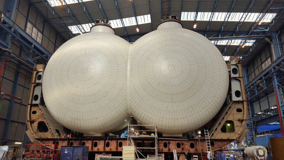 The tanker was built for the Dutch shipping company Anthony Veder (Rotterdam). The LNG gas tanker is used to transport liquefied natural gas (LNG) and has a length of approx. 163.86 metres, a width of 24.50 metres and a cargo capacity of 18,000 m³. The gas tanker is equipped with an environmentally friendly dual-fuel engine and also has auxiliary engines that are operated exclusively with LNG. Operation with liquid natural gas results in extremely low emission values, making this ship one of the most environmentally friendly of its kind. The LNG tanks were insulated with prefabricated PUR/PIR panels in a 2-layer design. For this purpose, the outer panel could already be supplied with a colour-coated steel plate. In the course of planning, all panels and contraction joints were placed on the tank surface by means of 3D rendering. This allowed on-site adjustment work and waste to be reduced to a minimum.