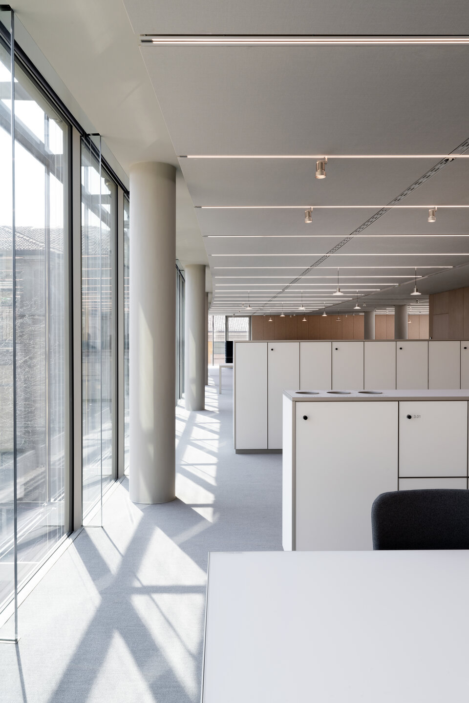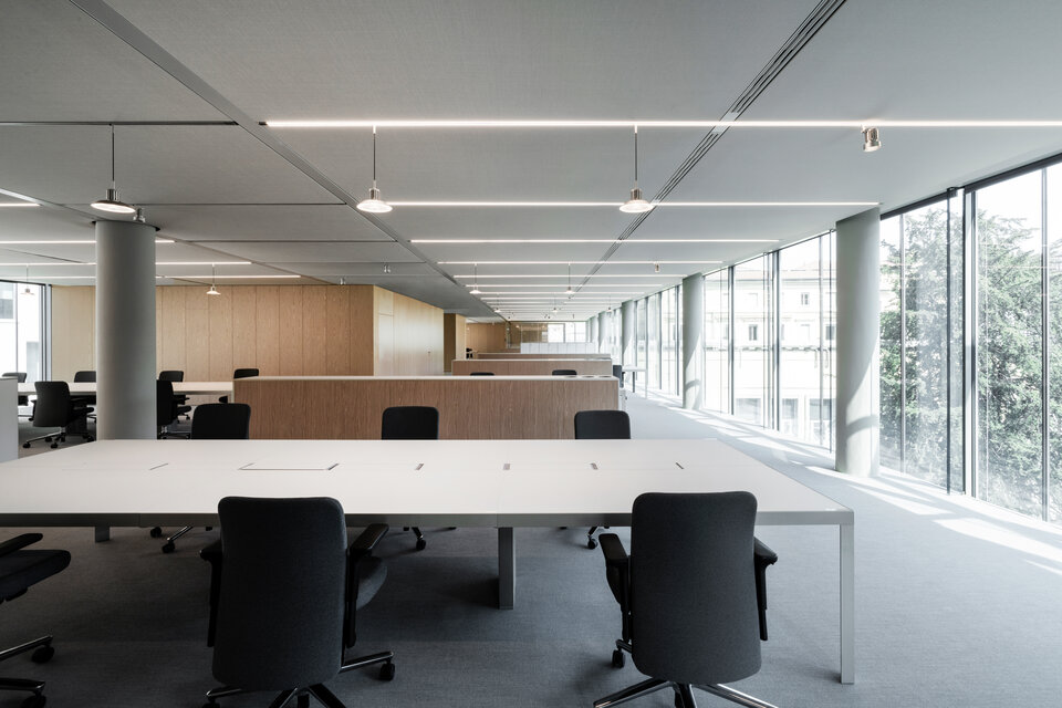 The renowned Milan-based architecture firm Park Associati was commissioned to create a workspace that combines architectural innovation with the highest standards of user comfort. Open-plan office environments dominated by glass and concrete surfaces present well-known challenges for room acoustics and thermal comfort – two performance criteria that are increasingly central to modern commercial fit-out and office interior design.