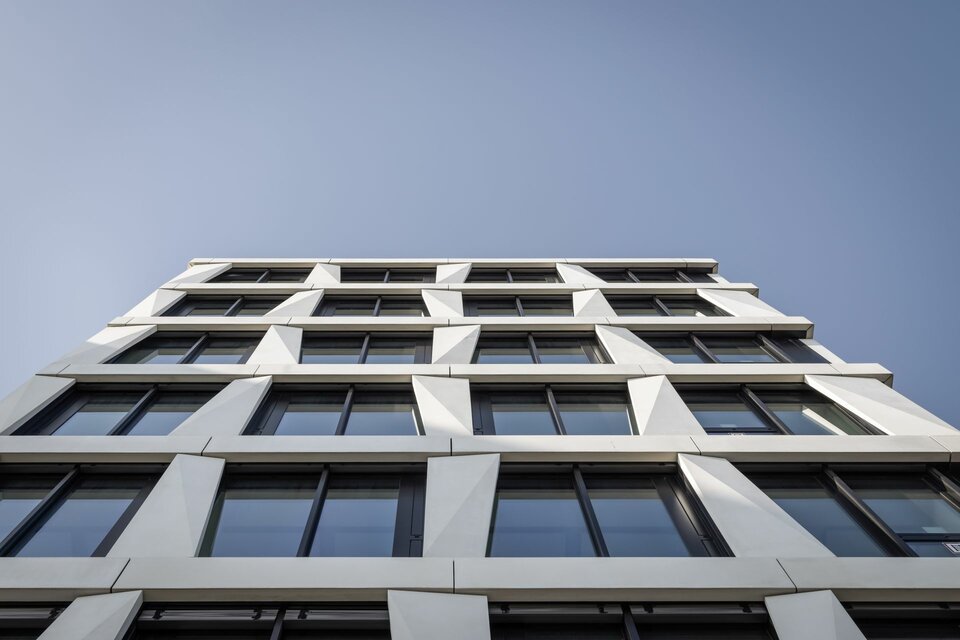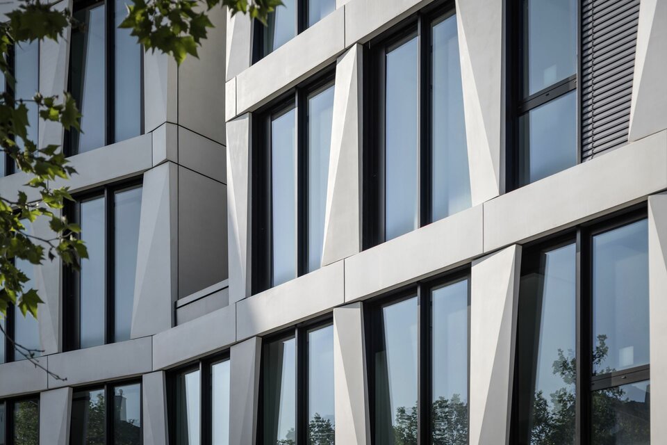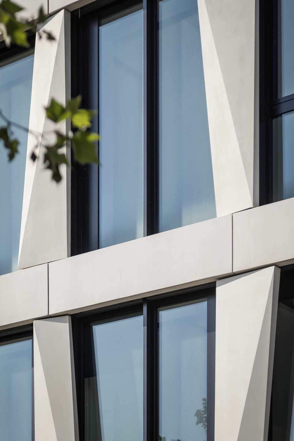 To prevent heavy dirt deposits on the white GFB façade elements, a special coating was subsequently applied: thanks to the active principle of photocatalysis, this has a self-cleaning surface effect on the one hand and actively cleans the air of nitrogen oxides through the natural exposure-rain cycle on the other.