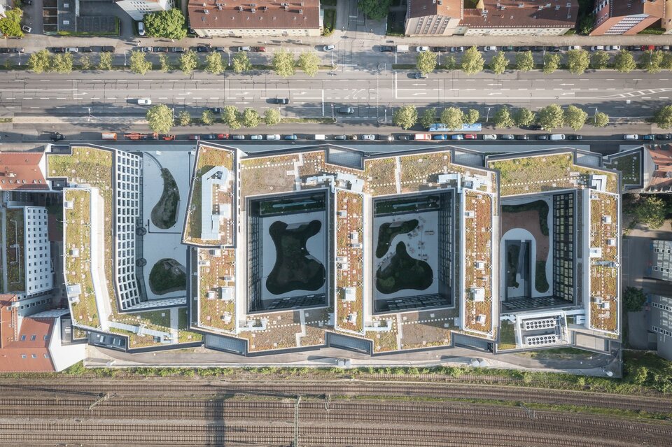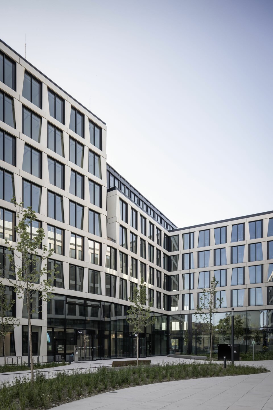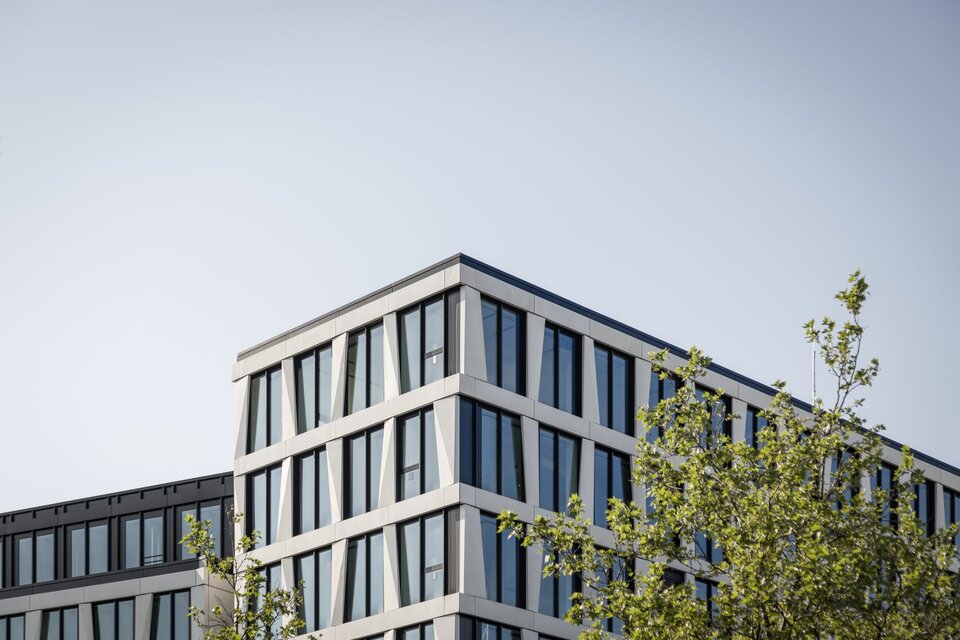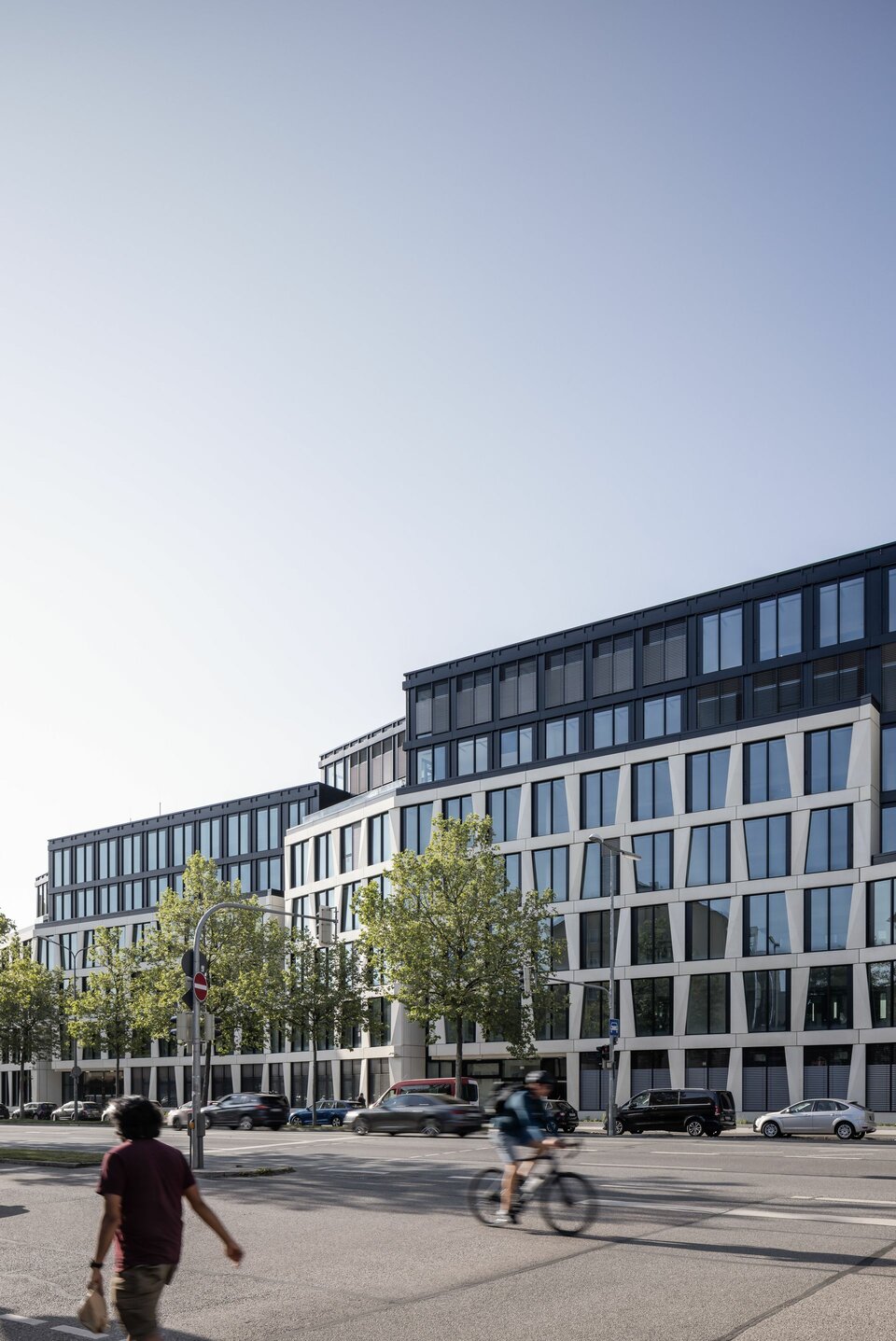 "A new gateway to the West" is how the 55,000 m² MARK office building presents itselfs, centrally located on the main suburban train line between Pasing and Munich Central Station. The four-part building complex extends over more than 200 metres and is up to eight stories high. Even from a distance, the MARK stands out with its striking, folded façade structure with three-dimensional façade elements, slight building setbacks and offset terrace areas on the upper floors. Depending on the sunlight, this creates a surprising lightness and individual play of light on the building.