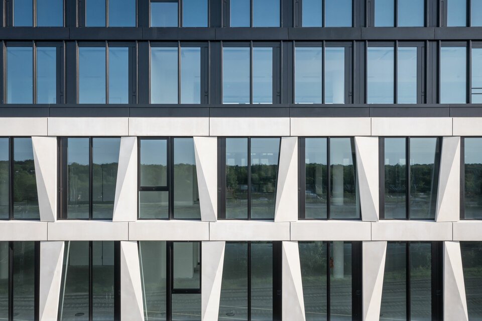 The main part of the façade, a total of approx. 18,600 m² of element façade, consists in its basic structure of two floor-to-ceiling windows embedded in black aluminium profiles, framed by curtain-type, three-dimensional GFB elements in white. Lindner manufactured 1,891 individual façade elements for this, which were prefabricated completely including windows in their own production and later attached to starter profiles on the building on site. Lindner also manufactured the 4,500 m² of 13 mm thin yet very stable LinCrete GFB elements in its own factory.