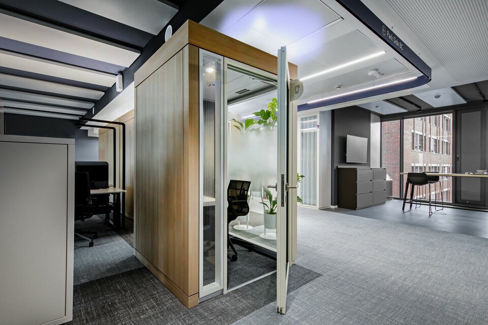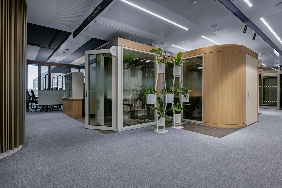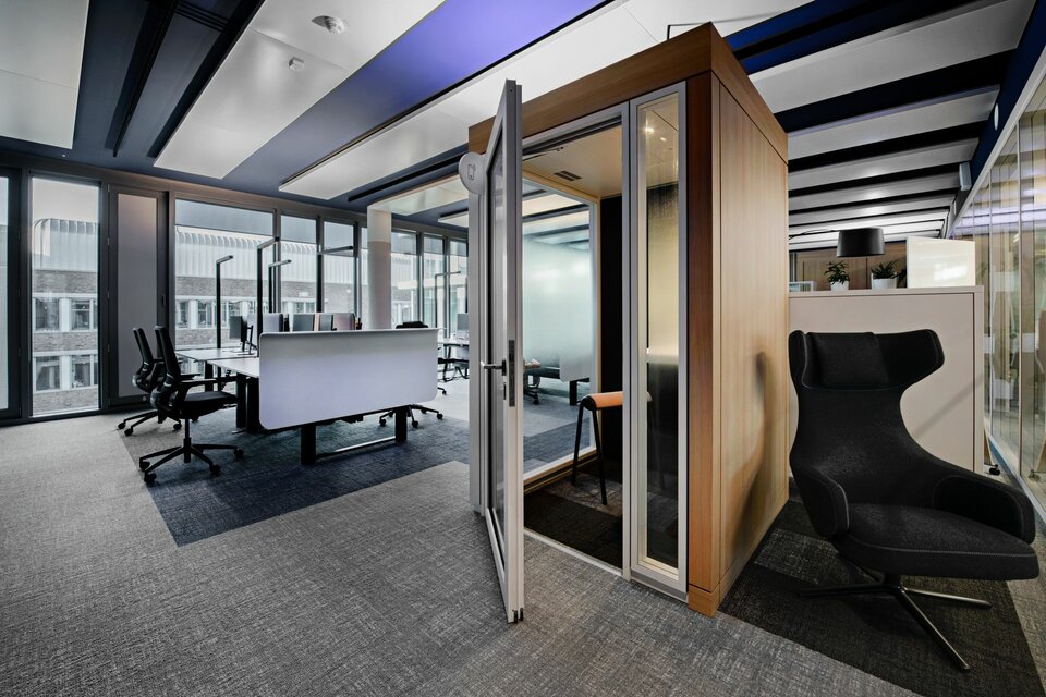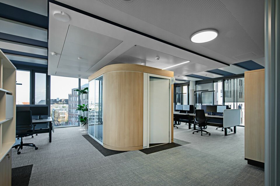 In realising the Beiersdorf Campus, the Lindner Group played a key role by providing customised solutions for efficient space design. Particularly noteworthy is the Lindner Cube with occupancy light: This innovative room-within-a-room system is renowned for its stand-alone construction, which requires no connection to walls or ceilings, thus contributing to flexibility and dynamism in modern office environments. The new occupancy light, discreetly mounted on the ceiling of the cube, was a standout feature. It automatically activates via a presence detector, indicating the cube's occupancy and promoting a disruption-free work atmosphere. This smart feature not only increases space efficiency but also optimises operational workflows. Additionally, the Lindner Cube allows for bespoke adaptation to a company's corporate design with a choice of colour options and different lighting elements.