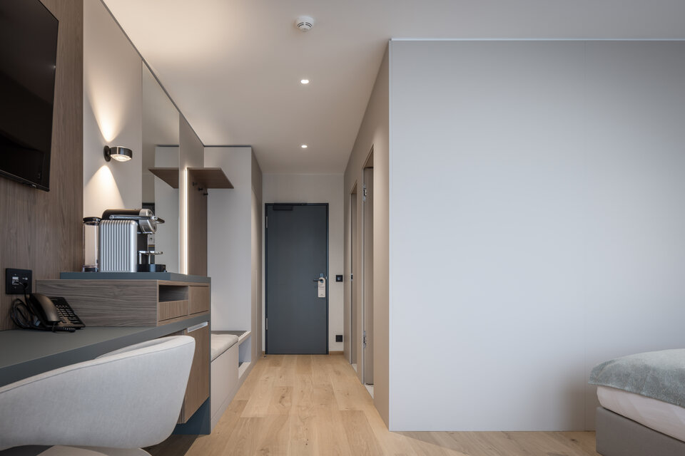 In moisture-prone areas, such as the bathrooms in the hotel, the special HYDRO system was installed – a dry hollow floor made from highly compressed cement fibreboards, whose water-repellent properties make it especially suitable for wet rooms.