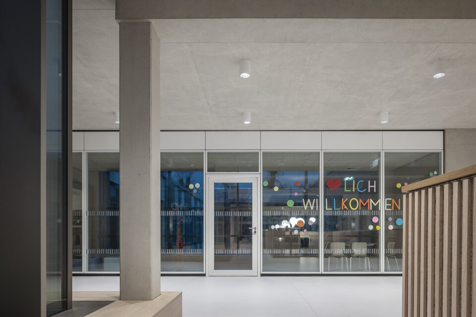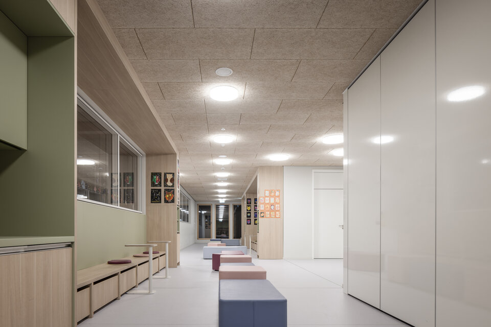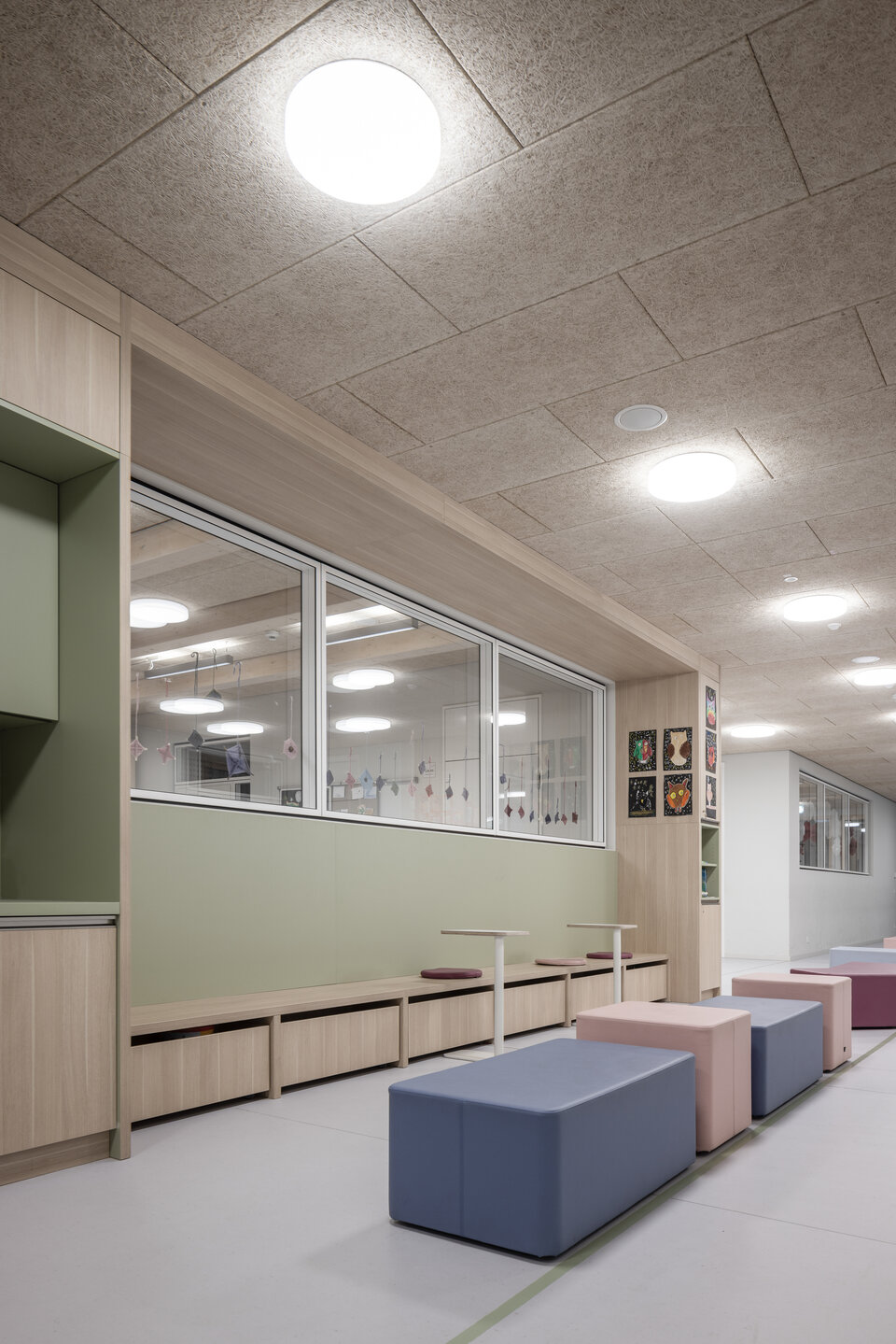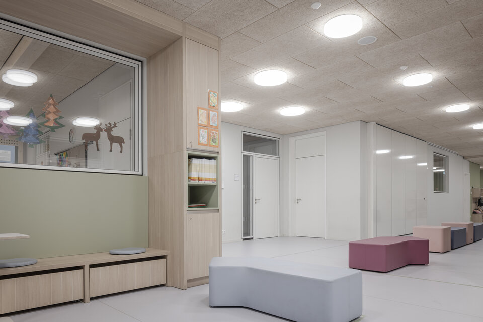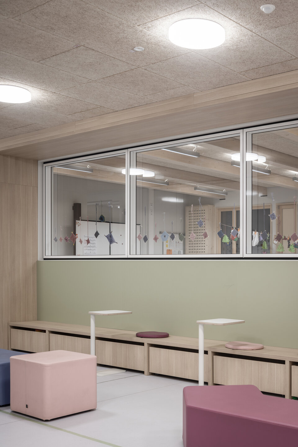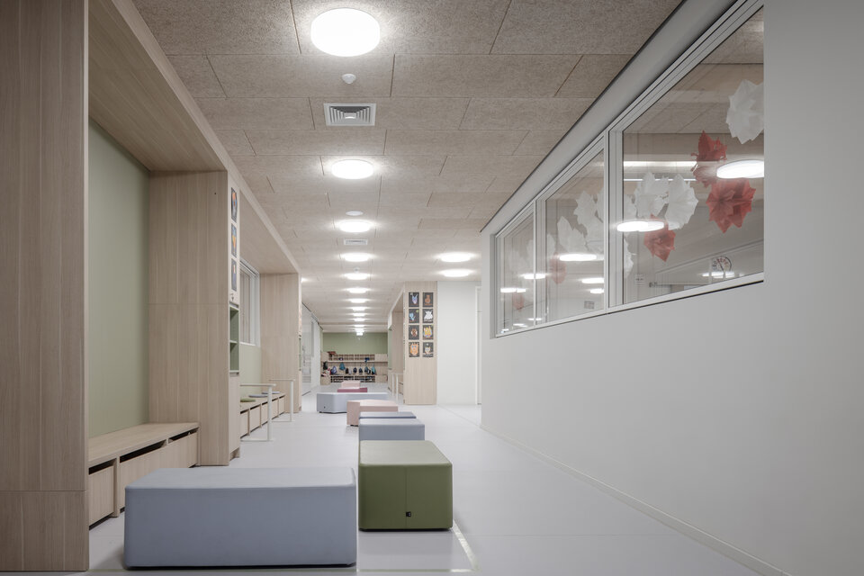 The kindergarten includes four group rooms with ancillary spaces, a multi-purpose room, and a central zone with additional functional rooms and a meeting point. In two other building sections, four learning clusters for the primary school are arranged over two floors. Interiors are deliberately calm, with a limited material palette and subtle colours.