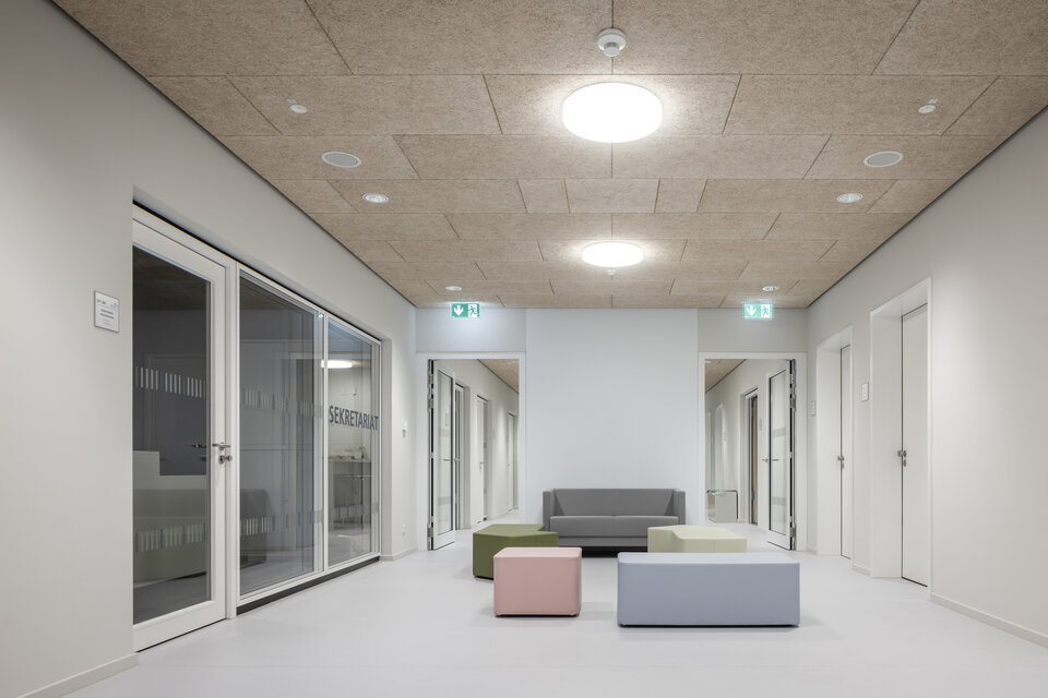 A high-occupancy educational campus places particular demands on the interior fit-out. Different room types – learning clusters, group rooms, the forum, and auditorium – require solutions that are durable, integrate seamlessly into the architecture, and reliably support daily operations. Fire protection, sound insulation, and visual connectivity are central to ensuring safety, concentration, and clear orientation throughout the school and kindergarten.