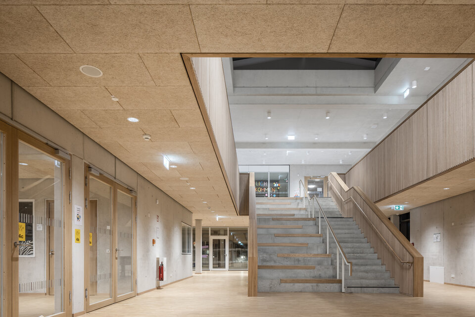 The Education Centre at Hertinger Tor brings together a primary school, a kindergarten with family centre, a triple sports hall, and a central auditorium within a new, modern educational campus. The building sections are organised around the forum, which houses the workshop, technical areas, and the so-called regeneration kitchen. This spatial arrangement promotes openness, interaction, and easy orientation throughout the school day. A central atrium with play and stage stairs connects the different areas.