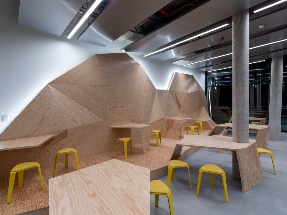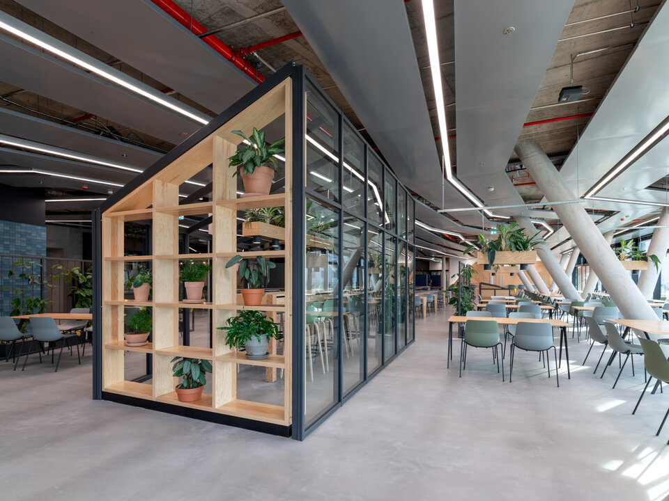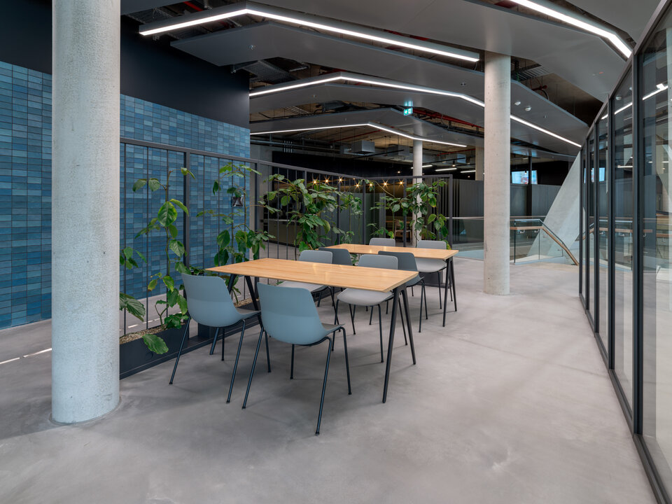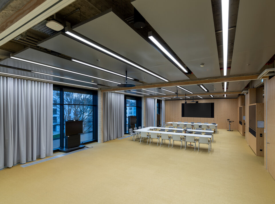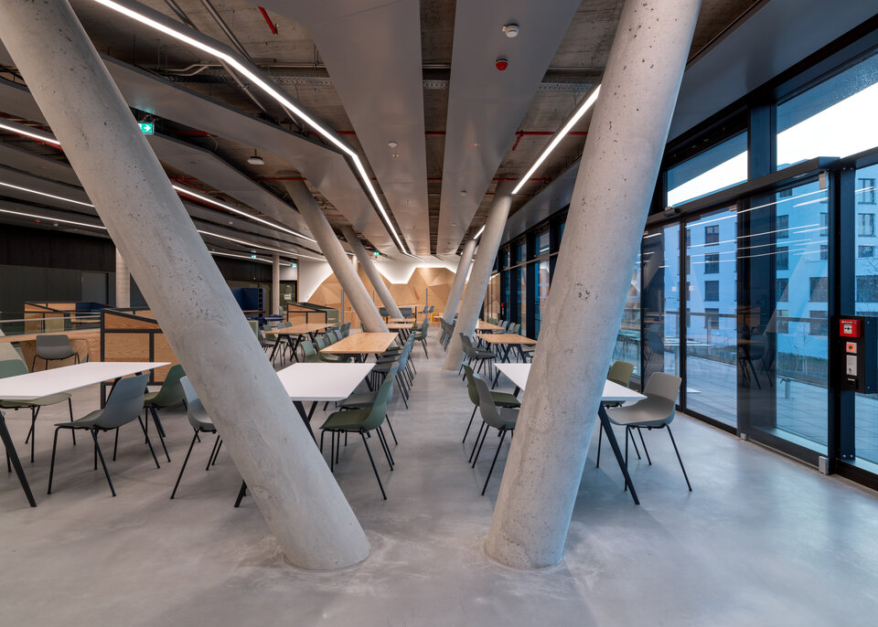 A distinctive design feature of the Media Centre is the custom-made heated and chilled canopy ceiling by the Lindner Group. The Plafotherm® DS 320 canopy ceiling regulates temperature through an effective combination of radiant and convective heating and cooling. In the canteen area, in particular, its radiating, almost wave-like design creates a dynamic atmosphere.