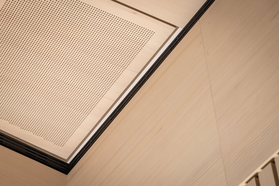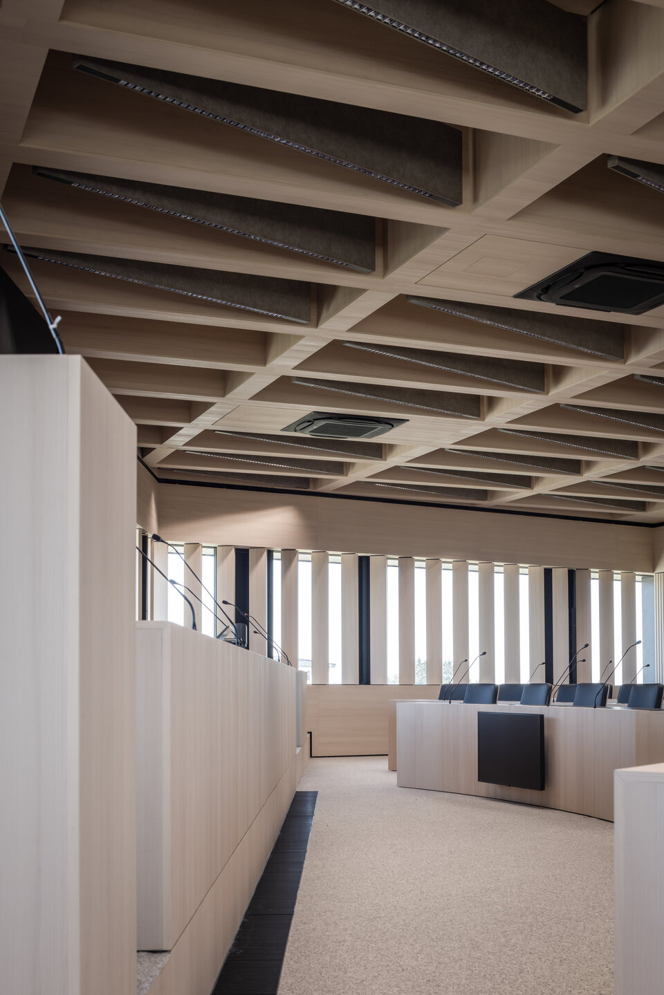 The ceiling cladding also blends harmoniously into the overall concept. Light-coloured timber, suspended LED luminaires and discreetly integrated cameras create a modern, functional environment. Perforated ceiling panels along the sides of the room are specifically designed to improve acoustics – a crucial factor for its use as a council chamber.