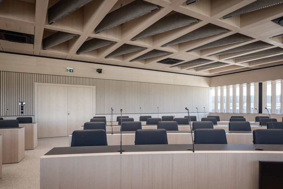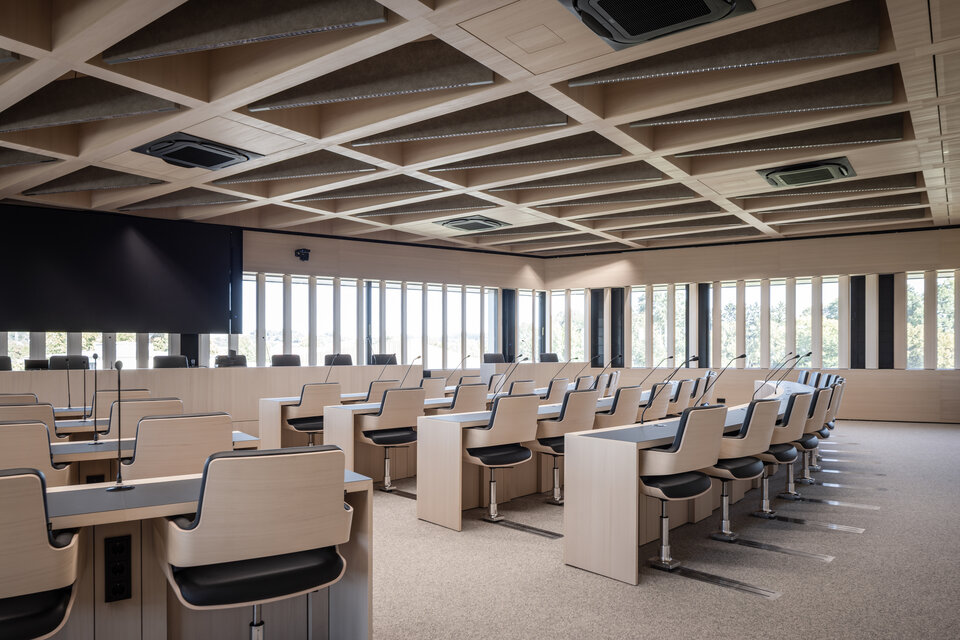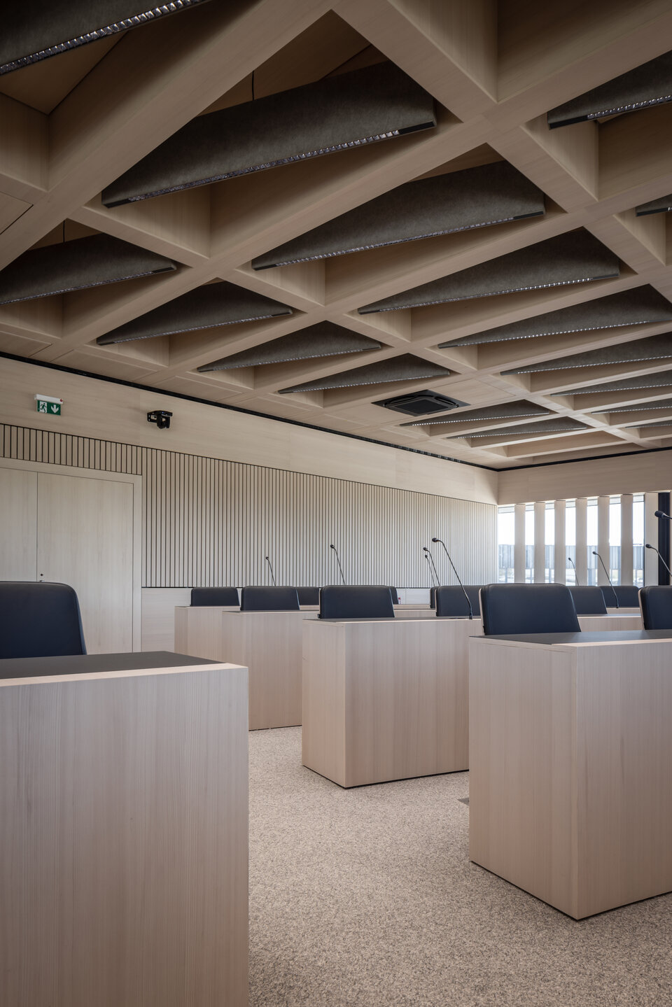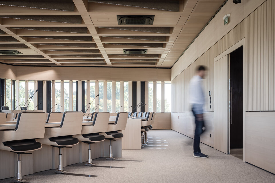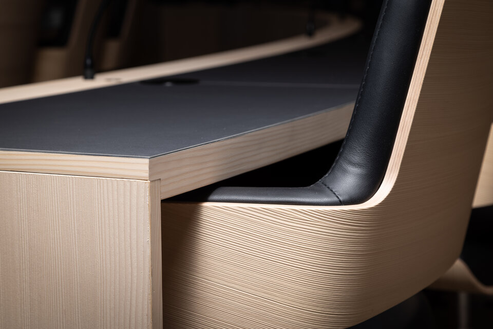 The design focuses on light-coloured timber contrasted with dark leather seating and tabletop surfaces with flush inlays of dark linoleum. This combination creates a warm yet elegant atmosphere befitting a modern administrative centre. Timber slats on the walls ensure pleasant acoustics and a harmonious overall appearance.