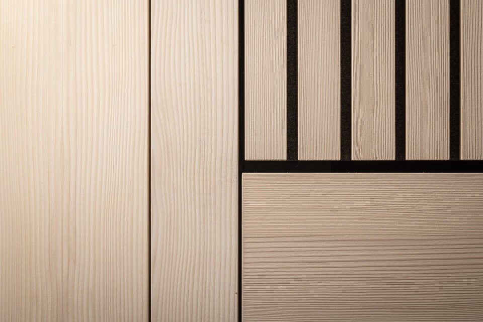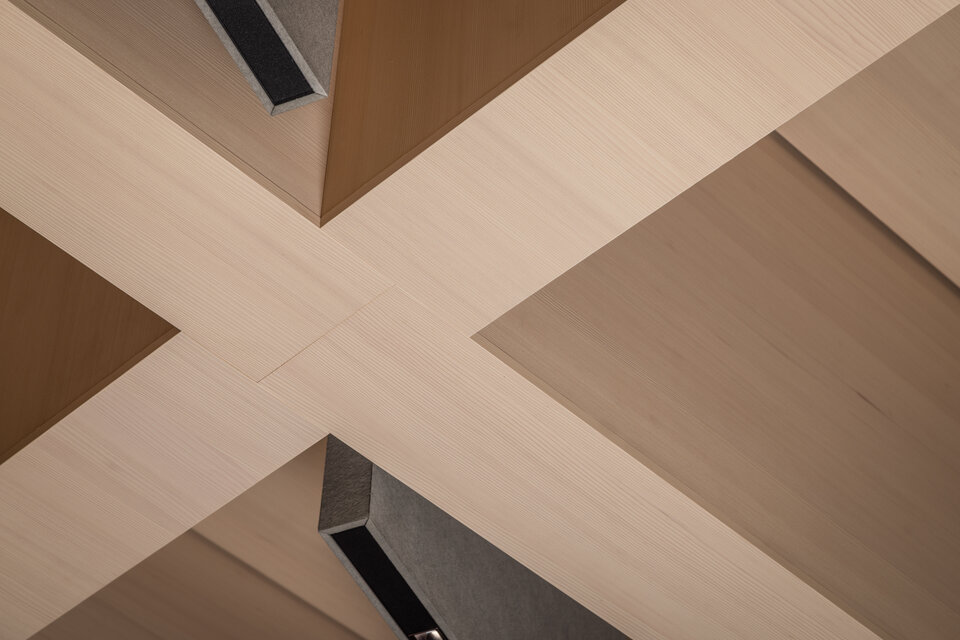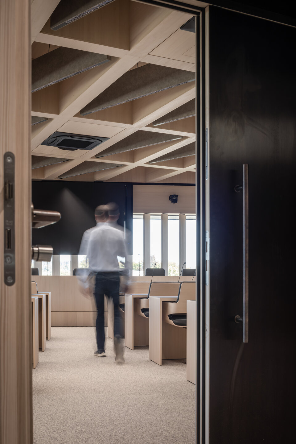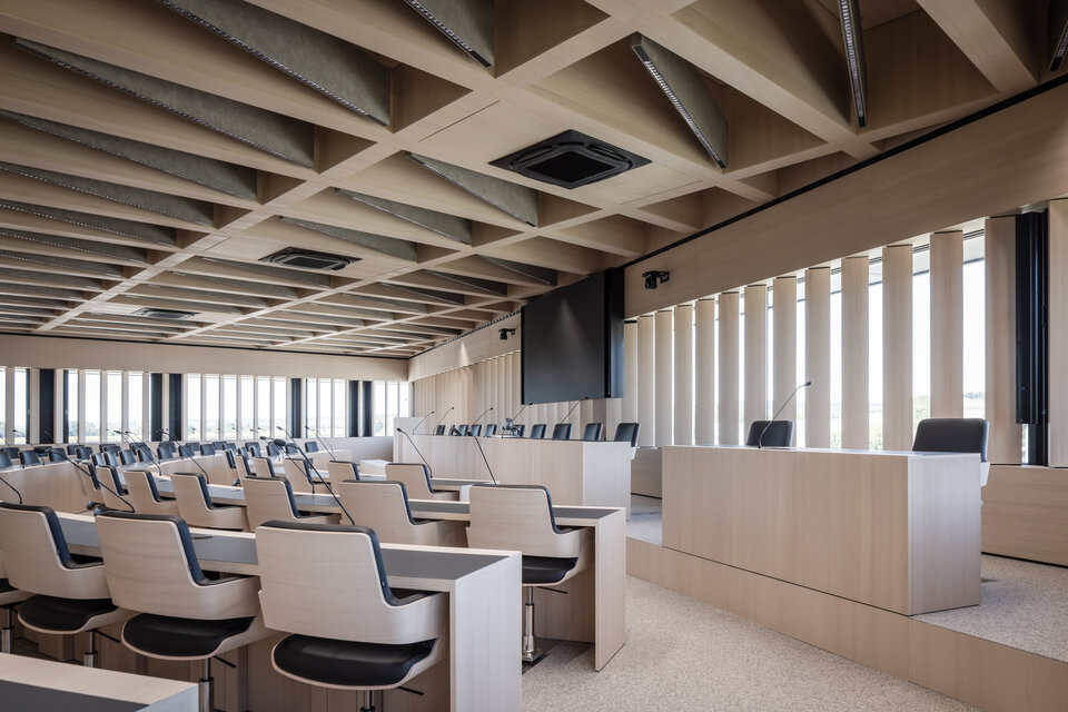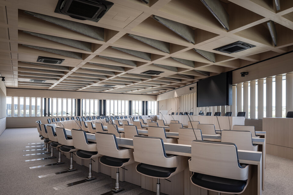 The design focuses on light-coloured timber contrasted with dark leather seating and tabletop surfaces with flush inlays of dark linoleum. This combination creates a warm yet elegant atmosphere befitting a modern administrative centre. Timber slats on the walls ensure pleasant acoustics and a harmonious overall appearance.