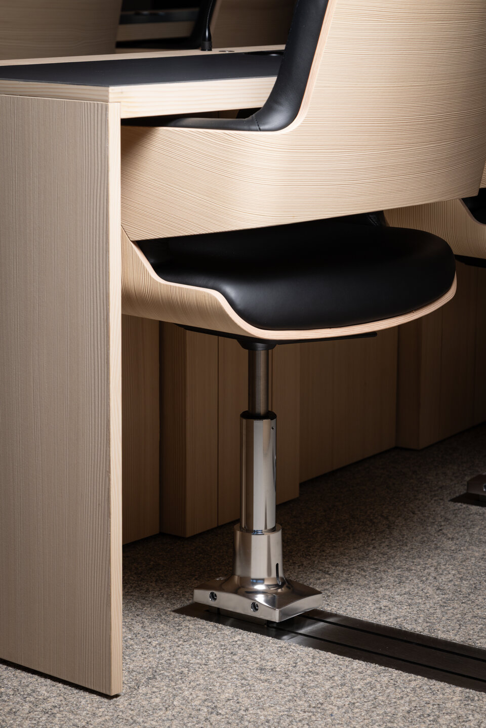 The hollow floor CAVOPEX comfort with its high-quality carpet covering not only provides comfortable walking surfaces but also offers maximum flexibility thanks to integrated installation openings and rail systems. Swivel chairs can be moved with ease. The tables are equipped with integrated microphones and sockets to discreetly incorporate modern technology into the design.