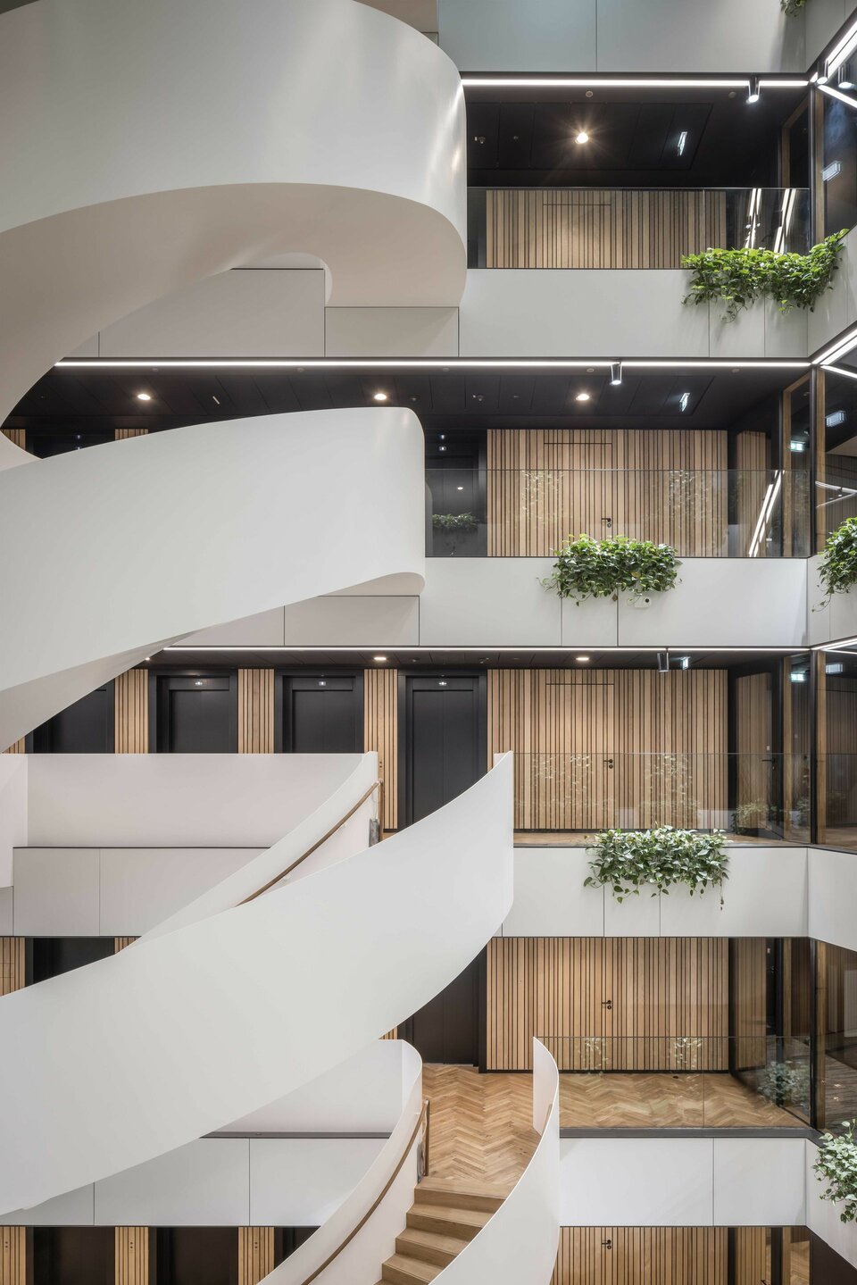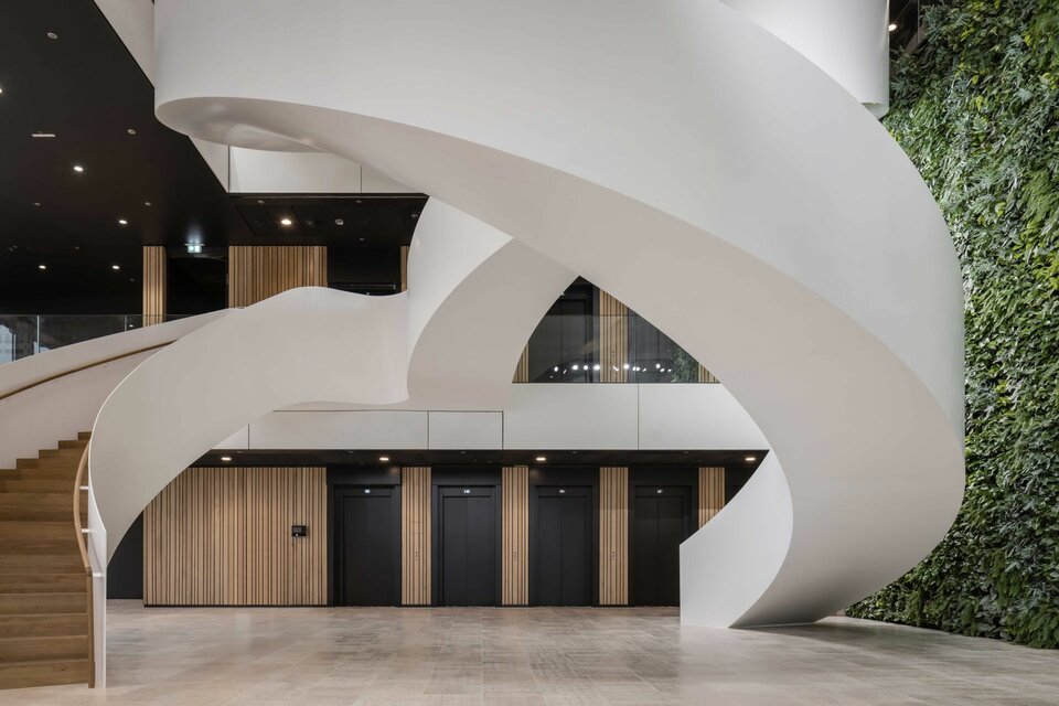 The new headquarters of the POST Luxembourg has been named "HELIX": The centrepiece of the building is a 30-meter spiral staircase in the shape of a helix that leads from the atrium to all eight floors. Since the term is the same in many languages, the name also symbolises the integration of over 50 nationalities represented in the postal workforce. Apart from that, the entire building stands for openness and cohesion: HELIX is intended to serve as a place of exchange for all POST employees and to bring together several locations.