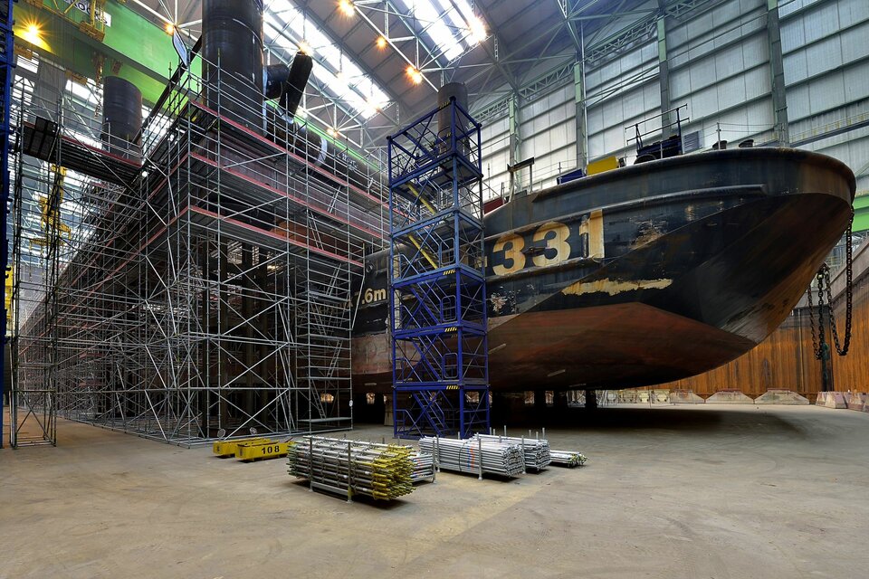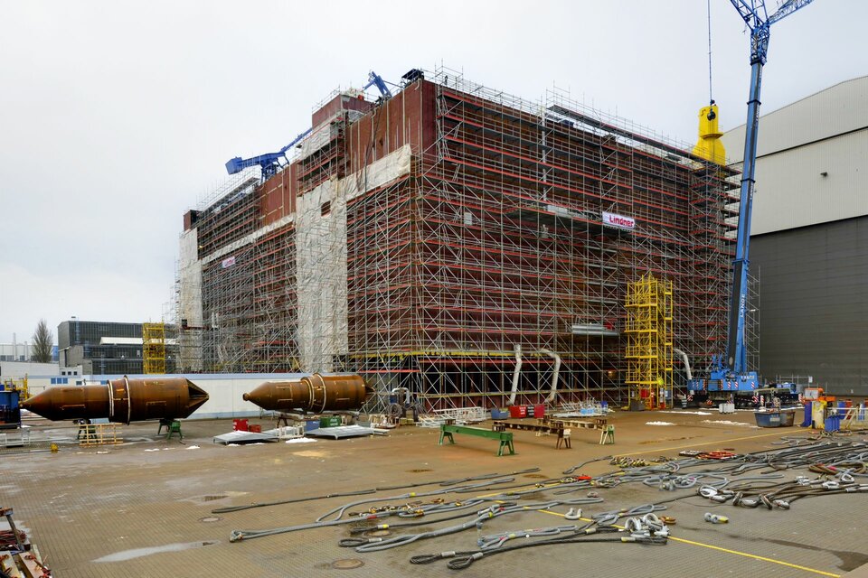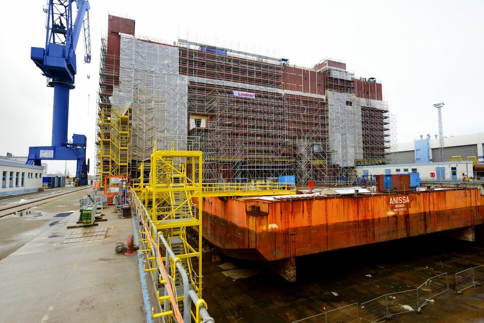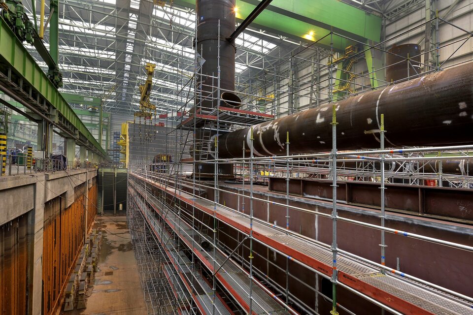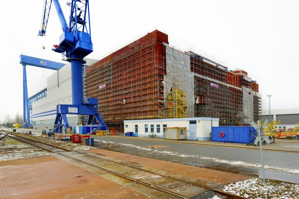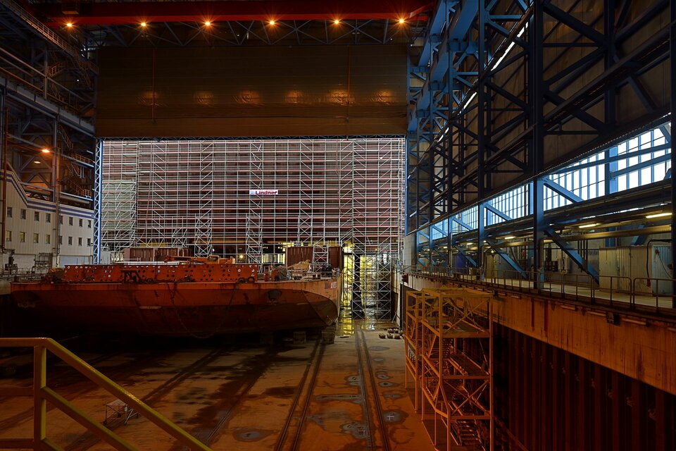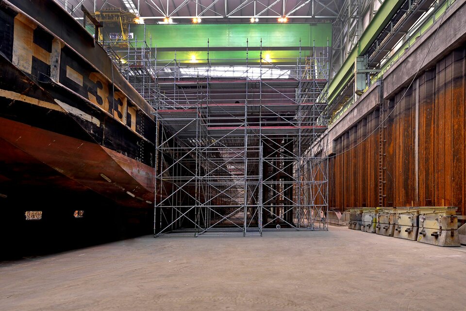 The offshore platform "SylWin alpha" is under construction at the Nordic Yards wharf for its later use in the windparks 70 kilometers western of Sylt. It is the largest platform with a height of 80 metres, a width of 56 metres and a length of 82 metres. It was built within a building period of only 6 months and a total of 450.000 m³ of birdcage scaffolding.