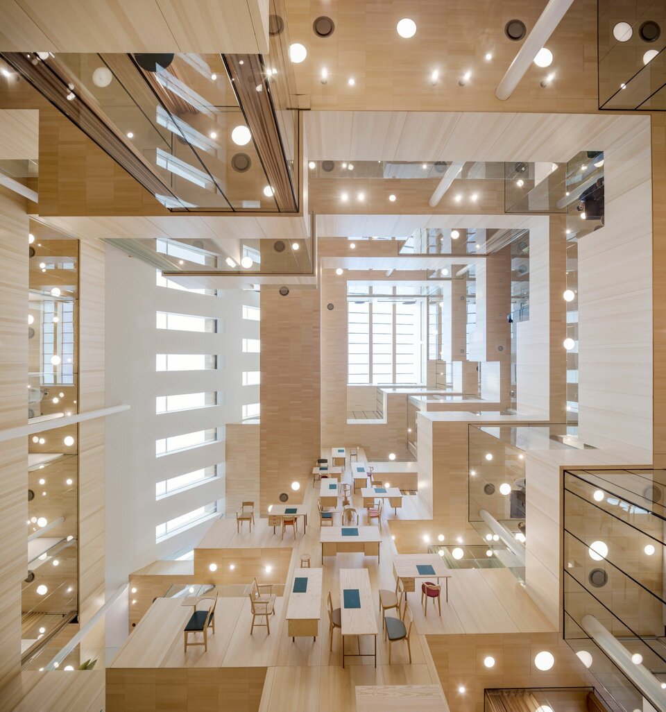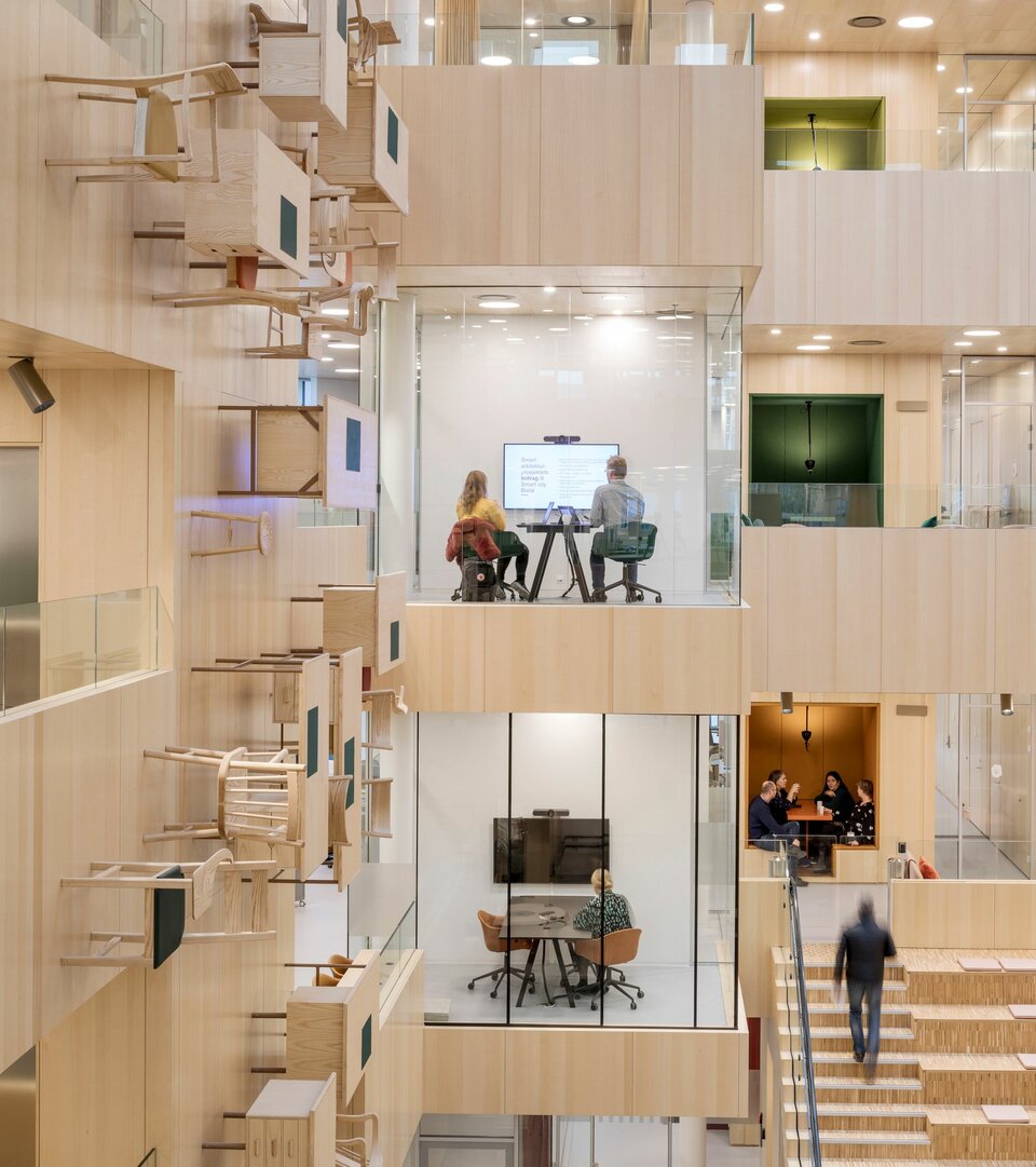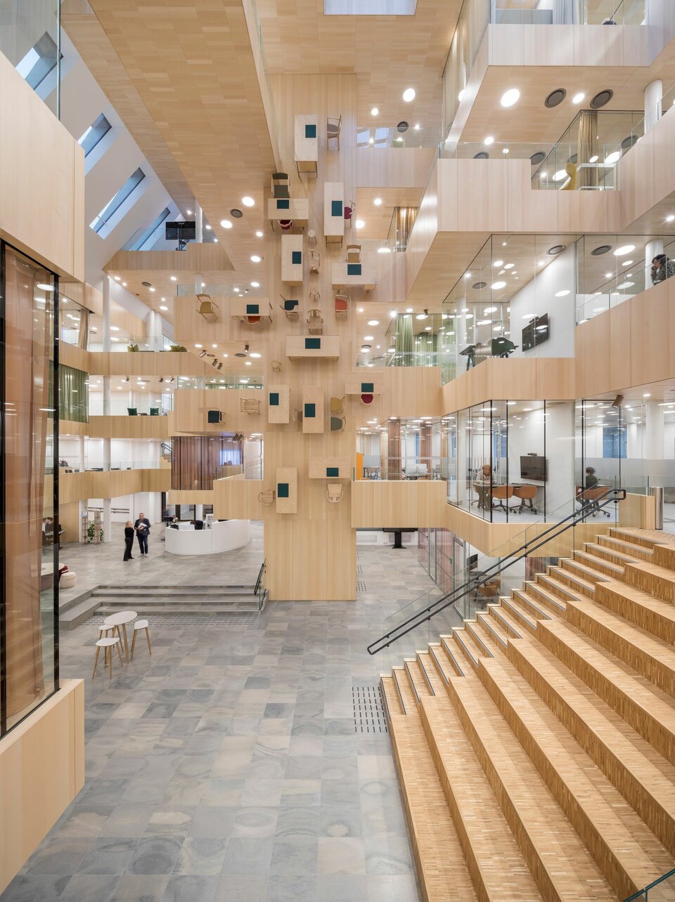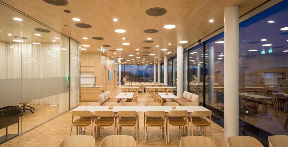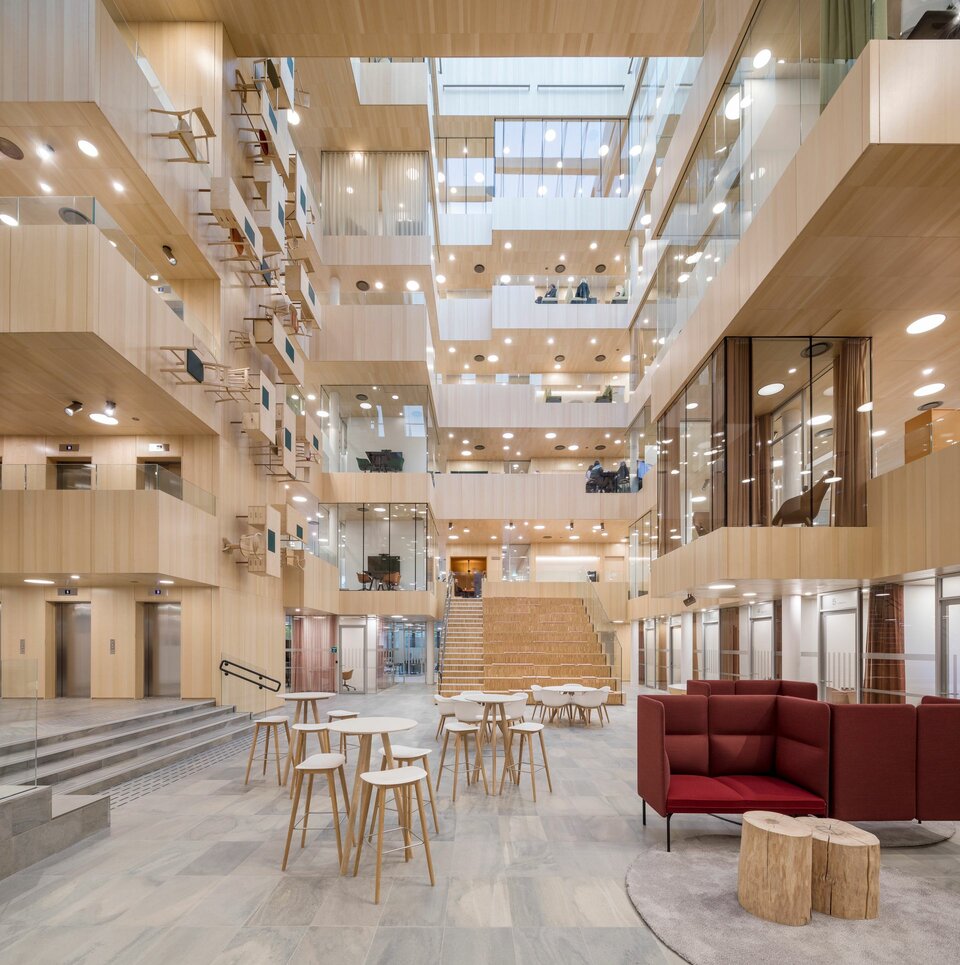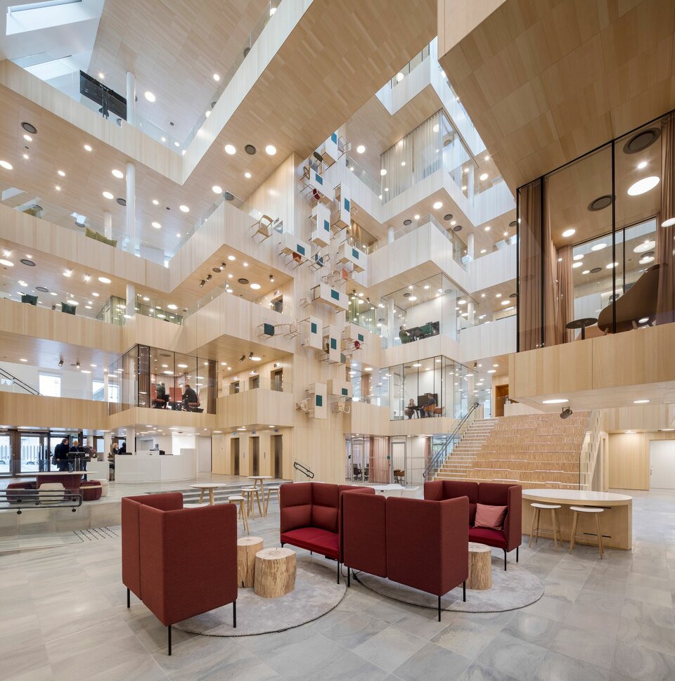 The International Projects division of Lindner SE contributed with a number of services, among others in the exceptionally designed atrium, whose arrangement reminds of the optical illusion of M. C. Escher. Here you’ll find, for example, 10,000 m² acoustically effective wall and ceiling claddings made of ash veneer, but also various performances of glass partitions – from full-surface fixed glazing to soundproof room-in-room systems in the otherwise open office areas. Theese were extended with glass doors that lead, for example, into the projecting meeting cubes. The parquet work and high quality radiator claddings are also made by Lindner.