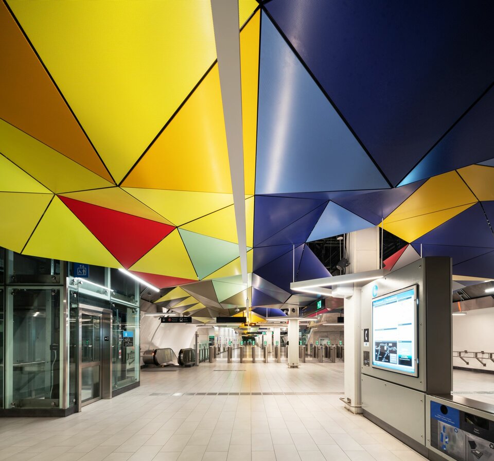 Large format triangular panels were used in this functional art installment (Lone Pine Sunset) by Vancouver artist, Douglas Coupland. The Ottawa Parliament Station ceiling's are cladded with Lindner perforated metal panels in 50+ various colors depicting a geometric sunset.