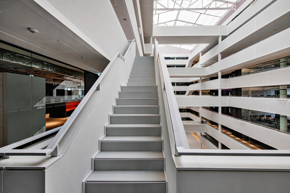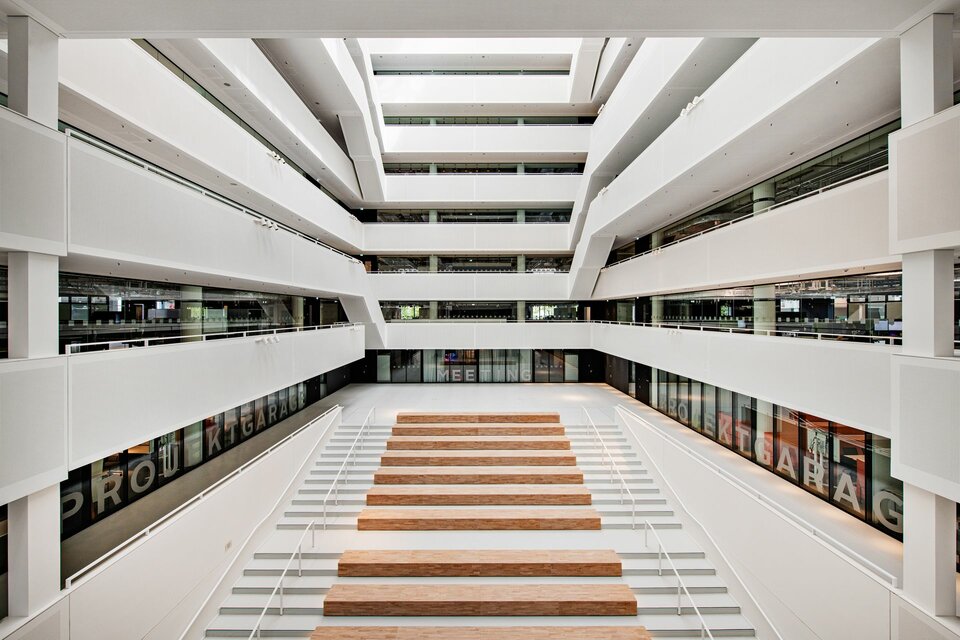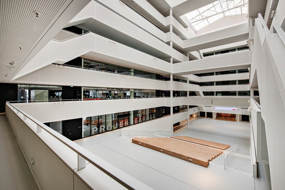 As part of a comprehensive renovation, an existing logistics building of the Otto Group in Hamburg was transformed into a modern office building. The building spans nine above-ground floors as well as a basement and, after the renovation, includes approximately 47,900 m² of gross floor area (GFA). A central innovation of this project is the subsequently integrated atrium, which spans over all eight floors and significantly contributes to the creation of an open and light-flooded space.