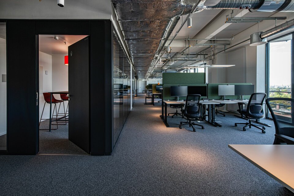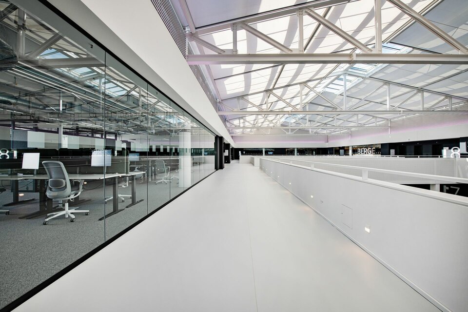 To provide sufficient retreat areas and effective space division within the office areas, Lindner Life Pure 620 glass partition systems were installed. These not only allow flexible use of the space but also contribute to creating an open and bright environment.