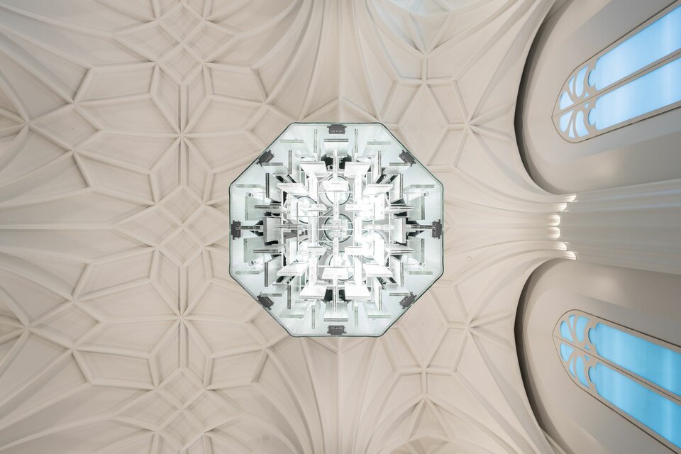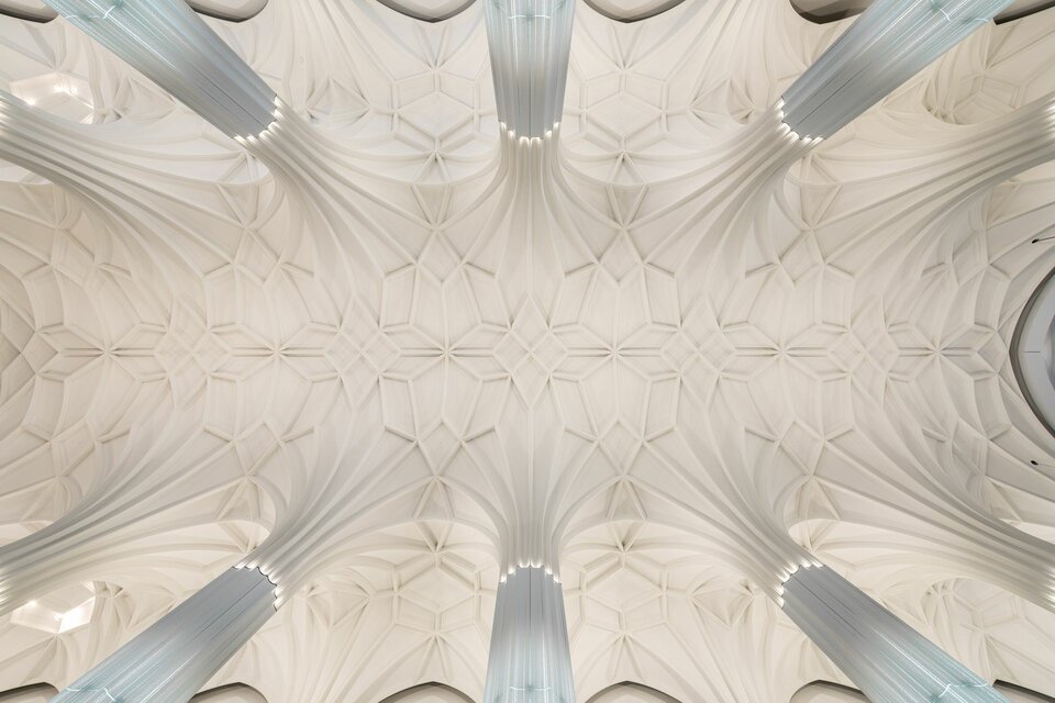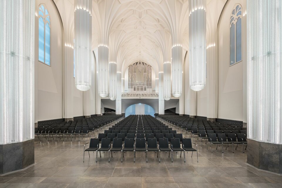 Lindner AG was contracted with a large scope of works for the interior fit-out of the auditorium. This includes the construction of a vaulted ceiling with numerous ornamentations that were created with stucco elements. About 3,200 metres of hollow stucco profiles have been fitted on an area of about 900 sqm. The auditorium features 16 pillars, which have been cladded in glass, a total of 320 individual panes. Natural light shines through eleven gothic windows, whose construction was also the responsibility of Lindner. As to the flooring, the choice was in favour of FLOOR & more® comfort, a powerful hollow floor with integrated heating technology. At the same time, its natural stone covering completes the sophisticated aura of the room.
